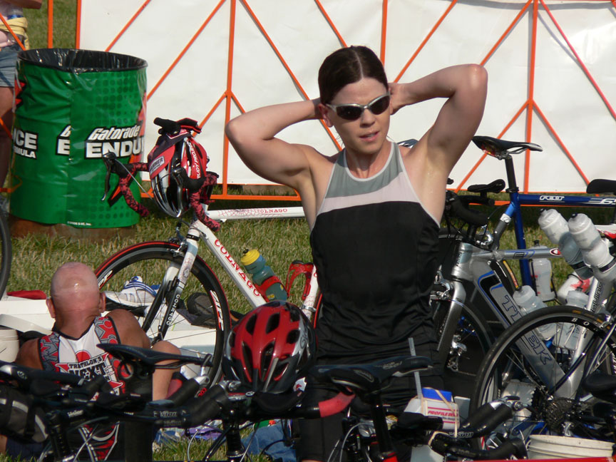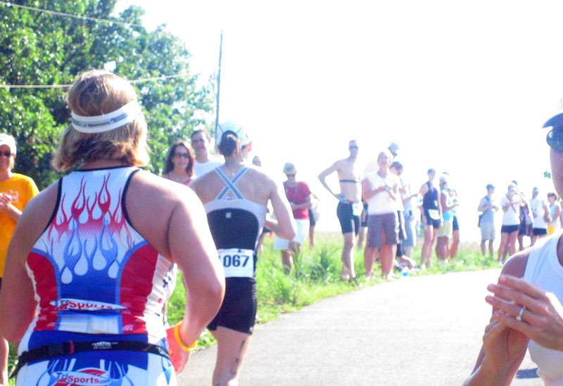 T2: Helmet off, running hat on. Usually I leave it in a ponytail, but in this race I had to get it off my neck. I do this while running out of T2.