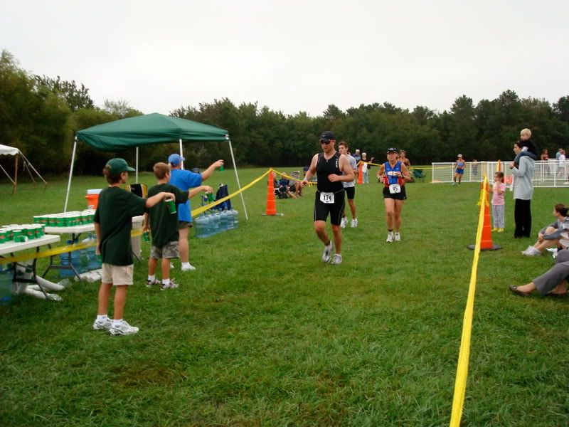 The last 300m or so of the race is across a grassy field back to the transition area. I saw the crowd assembled in the chute, and then I saw the finish line. It was at about that point that I got this ear-to-ear grin that just wouldn't go away. I dug deep and managed to sprint it out with a guy who snuck up behind me--not even in my division, but hey--it's the finish line.