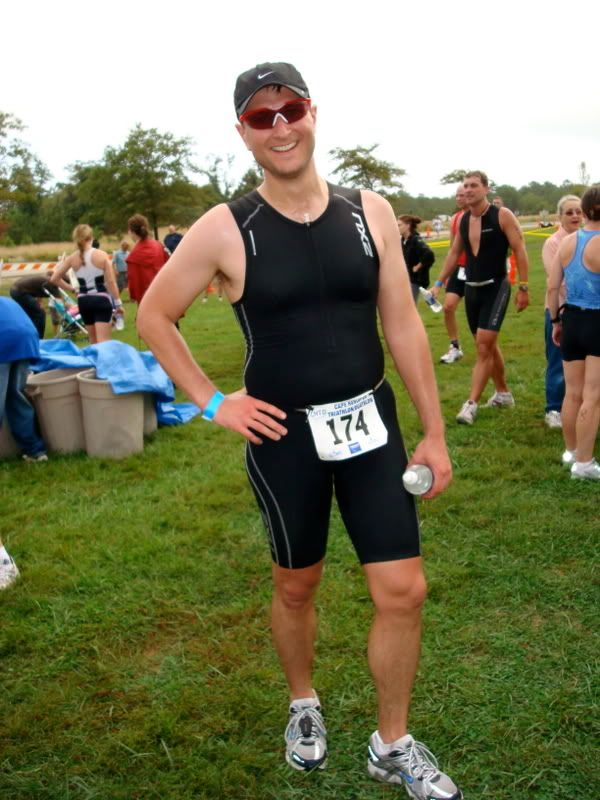 Nothing too impressive, but quite the accomplishment for me! In July, just finishing a 5K at that pace was a victory! So, the things I learned: 1. I really need to work on transitions. Not that it would've made a huge difference, but I easily wasted almost a minute in each transition fumbling around. I need to practice T1 and T2, and it hadn't been a part of my training. 2. I think I'll add some run/bike bricks into my training to cover this eventuality. I didn't really feel ready to start with a run, and I think it took more out of my legs than a swim would have. 3. I really should've worn my Garmin. It's great to have in training to make sure I'm keeping my legs turning over and watching my HR to know I'm not blowing up. I feel like I could've pushed harder across the board had I known what my body was doing. 4. You can make up A LOT of ground on the bike. 5. My run needs help. I've built up a decent base training for a 1/2 marathon this October, but I'm desperately in need of a little speed work. Relative to my bike, my run is awful. 6. I had a blast, and am totally a convert to the world of Tri. The field was very cool and supportive, I love the fact that folks from all over the spectrum were competing in the same event, and I found myself idolizing the older AG racers who were still out there going strong into their 60's and 70's. It's really an inspiration, and I hope I can be standing on that podium when I turn 70! 7. It takes a while for the post-finish grin to wear off. And thanks most of all to my wonderfully awesome wife, who had work yesterday and has more work tonight, but still drove out in our 2nd car to be with me for my big day, and to take the pics you see above, all while 20 weeks pregnant! She rocks. Edited by DrPete 2008-09-28 6:36 PM |