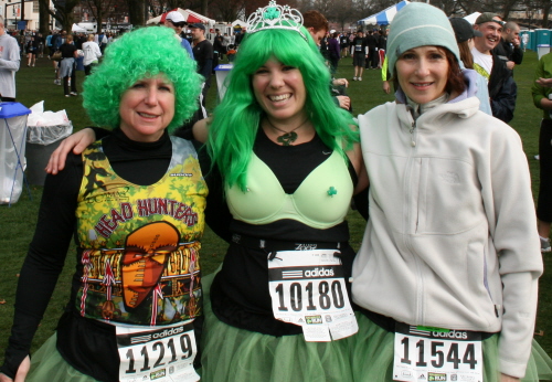 It took all of our cushion time just to find the bag check, hit the porta potties, and work our way through the mob to the starting line. No real warmup, just jumped around a little to fight off the chill in the air. And smiled and waved as people oggled our outfits.