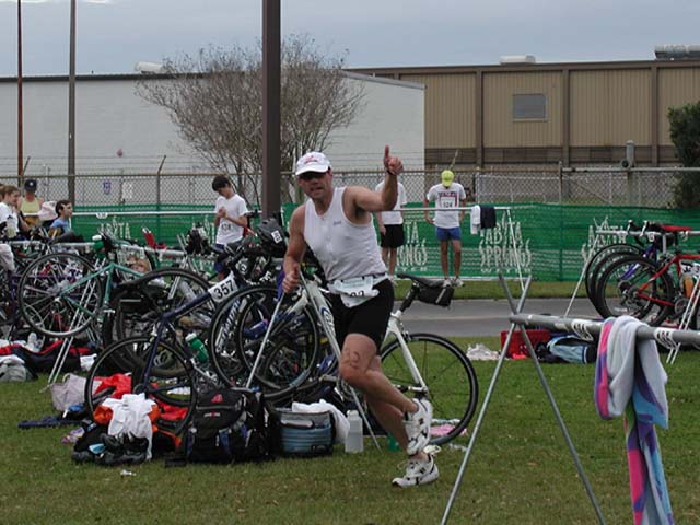 Warm down: Recoverite drink (2 Scoops 18oz) What limited your ability to perform faster: No speed training has been performed. Training focus has been on endurance for longer events later in the season. I entered the race with a goal of finishing in under an hour. I hoped to accomplish the race with a time around 55 minutes. My swim time was off my estimated pace by about 1 minute due to a higher breathing rate, a lack of bilateral swimming and a couple of mishaps. I was a little slow in T1 getting my stuff out of my Trans Bag, which cost me at least one minute. I had to run with my cycling shoes as a result of the rain. It maybe cost me 10 seconds trying to clip into the wet pedals. On the bike, I should have stayed more aero. T2 could have been smoother with the transition to the running shoes. I had to sit down to fix the foot liner in one. I also should have grabbed the number belt and put it on while running. On the run I performed about as well as expected coming off the foot injury three weeks ago. An 8:30 pace is faster than what I had been previously training at. Event comments: I entered the race with a goal of finishing in under an hour. I hoped to accomplish the race with a time around 55 minutes. My swim was off my estimated pace by about 1 minute due to a higher breathing rate and a couple of mishaps. I was a little slow in T1 getting my stuff out of my Trans Bag, which cost me at least one minute. I had to run my cycling shoes as a result of the rain. It maybe cost me 10 seconds trying to clip into the wet pedals. T2 could have been smoother with the transition to the running shoes. I had to sit down to fix the foot liner in one. I also should have grabbed the number belt and put it on while running. Last updated: 2004-10-03 12:00 AM