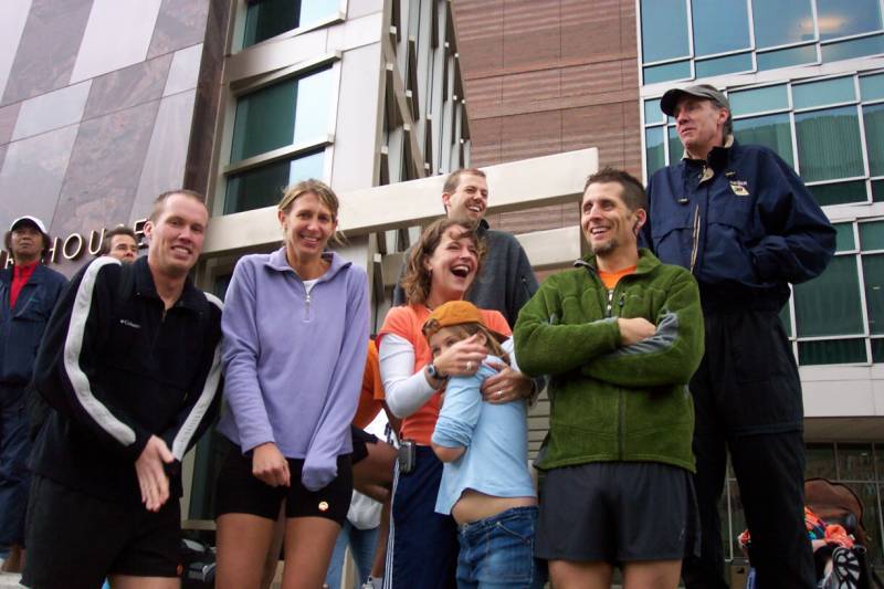 Up at 6am, downed a glass of orange juice, and drove downtown. Couldn't quite decide on what to wear, given that it was 52 and foggy, with showers predicted. Went with the tech shirt and shorts, hoping to dump the fleece on a spectator when the time was right.