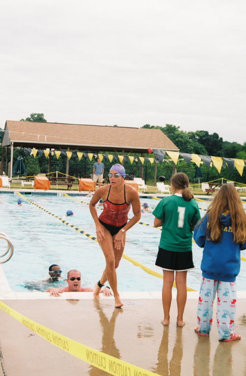 Got up at 4:45 a.m. to get to the club by 5:30 a.m. to pick up race chip. This is because DH was in a BBQ competition (he took reserve champion - better than I did!) and had to leave the house by 6:30 a.m. to pull the meat off the smoker. Came back home, got the kids up, dropped them at my parents and got to the swim club with my moral support and cheering section (my oldest son). Reminding myself to never again do a race on a weekend that Barry is committed to a BBQ. Got to the club about 8:00 for a 9:03 start. This pre-race routine sucked. I was not in my zone at all. Too many details non-race related to take care of (read: kids). I was antsy and nervous and could not concentrate.