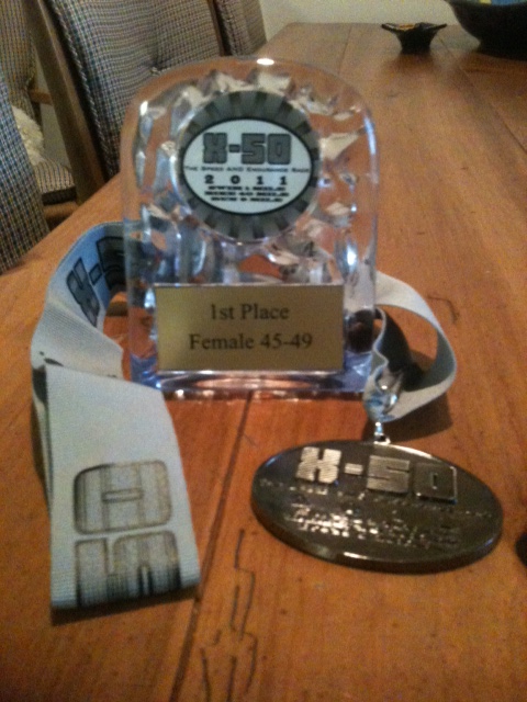 Warm down: So my fellow Ironman training friends and I were given an "extra credit" assignment for after the race by our coach. We were lucky enough to get to run 6 more miles! Yay for us! We gathered up after resting for a few minutes and headed back out up the trail while all the other finishers sat around eating and watching the awards ceremony. At this point, none of us cared about the pace lol so we'd run/walk/run/walk/stop at the water stop/walk/run/walk/run/etc. We ran by the man announcing the finishers (there were still others coming in from the run) and he said into the microphone "STOP WORKING OUT" and "Ya'll are SICK!") Denise had a leg injury going on, so she stopped and told us to go on. I think Michael and I ran maybe another mile and were debating the whole way whether we wanted to keep going or call it a day. Just as we decided to keep going and finish it up - my calve cramped big time and stopped me dead in my tracks. A woman walking by saw it happen and she said "Sometimes we need to listen to our bodies" lol (I wanted to say "Yes Mother"). So we stopped at 3.5 miles out of the planned 6. Unfortunately, by the time we finished our "extra credit", all the booths with food had been taken down! We went up to transition to pack up our stuff so we could find some food somewhere. As we're in transition, Denise is told by a woman that I must have placed in my age bracket, because she got 3rd and there were only 3 of us! Well, for anyone that knows me, I am not a fast swimmer, a fast cyclist OR a fast runner. I am mediocre, but I can go forever. So it's actually pretty pitiful for me to PLACE in anything lol But when you have a small race, anything is possible! So we got all our stuff packed up and headed back to where the timing tent was to see if I actually had placed. I was still in disbelief lol The woman at the timing tent finds my age group print out and says "You didn't just place - you WON!" Unbelievable. And actually pretty pitiful lol because again, I am not fast. I guess it pays to be the youngest in the age bracket, especially when there's only 3 of us lol So she hands me this most awesome plaque (and the finisher's medal is next to it). I'm still in major disbelief lol It will probably never happen again lol but it sure was FUN! What limited your ability to perform faster: Again, spending too much time asking the volunteers at the water stop where the beer was! (Which I didn't get any of since everyone was gone by the time we finished our extra credit!). Event comments: LOVED this race - they just need to get the roads fixed and also swept if at all possible. There was lots of loose gravel and sand in many places. Last updated: 2011-05-17 12:00 AM