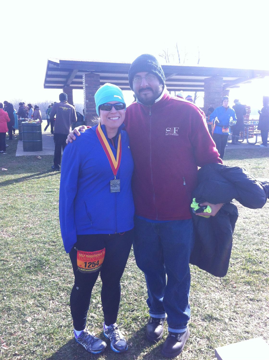 Comments: Mile 2: Chucked my throwaway shirt. Mile 2.2: Realized I had to use the porta potty at the very first aid station which was annoying, but I wanted to be comfortable during the race and wasn't trying to PR or anything. Mile 3: Ahhh. My feet and hands are FINALLY warm again. Mile 6: Took a gel and started feeling a nagging pain in my left knee, like your run of the mill IT band thing. This usually happens on runs longer than 1 hour for me. More annoying than anything at this point. Got to appreciate the craftmanship of a truly masterful crocheted turkey hat. Mile 9: Things slid downhill. I realized my hands had turned back into ice blocks, and with my medical condition, this is like an all-consuming pain as all blood leaves my hands and my body struggles to force bloodflow back down there. My water bottle that I brought with me must have started leaking onto my doubled-up cheap stretchy gloves from Target and the cold water just soaked in, but I didn't realize this for a while so didn't take off the gloves for fear of my hands getting even colder. So, partly in tears because of the pain in my hands and frustration of my knee really starting to seize up at this point, I started walking and tried to warm up my hands on my body, wondering how on earth I was going to last another hour in this state. And then I saw Chris! It's like he *knew* I needed to see a friendly face at that point. He jogged along side me in the grass for about a mile, and I took my wet gloves off, handed him my water bottle and he gave me his giant brown gloves to finish the race in. As soon as I put them on, it felt like heaven and even though my knee was still hurting, that was the mental boost I needed. A photog was stationed right there and captured a pic of the two of us. I'm sure I'll look terrible in that pic, with a weird gait from the knee thing happening and giant man gloves, but I'm pretty sure I'll buy it because it meant everything to have him there at that moment, when I was ready to bag the race and seek shelter on the warm shuttle bus. What would you do differently?: Buy real waterproof running gloves to go over my trusty cheap Target stretchy gloves. NOT carry a water bottle in freezing cold weather. I was just nervous to ditch it after I had done all of my long runs with it - I wanted to stick to "nothing new on race day" and I got stuck with ice blocks for hands instead. ![]() Post race