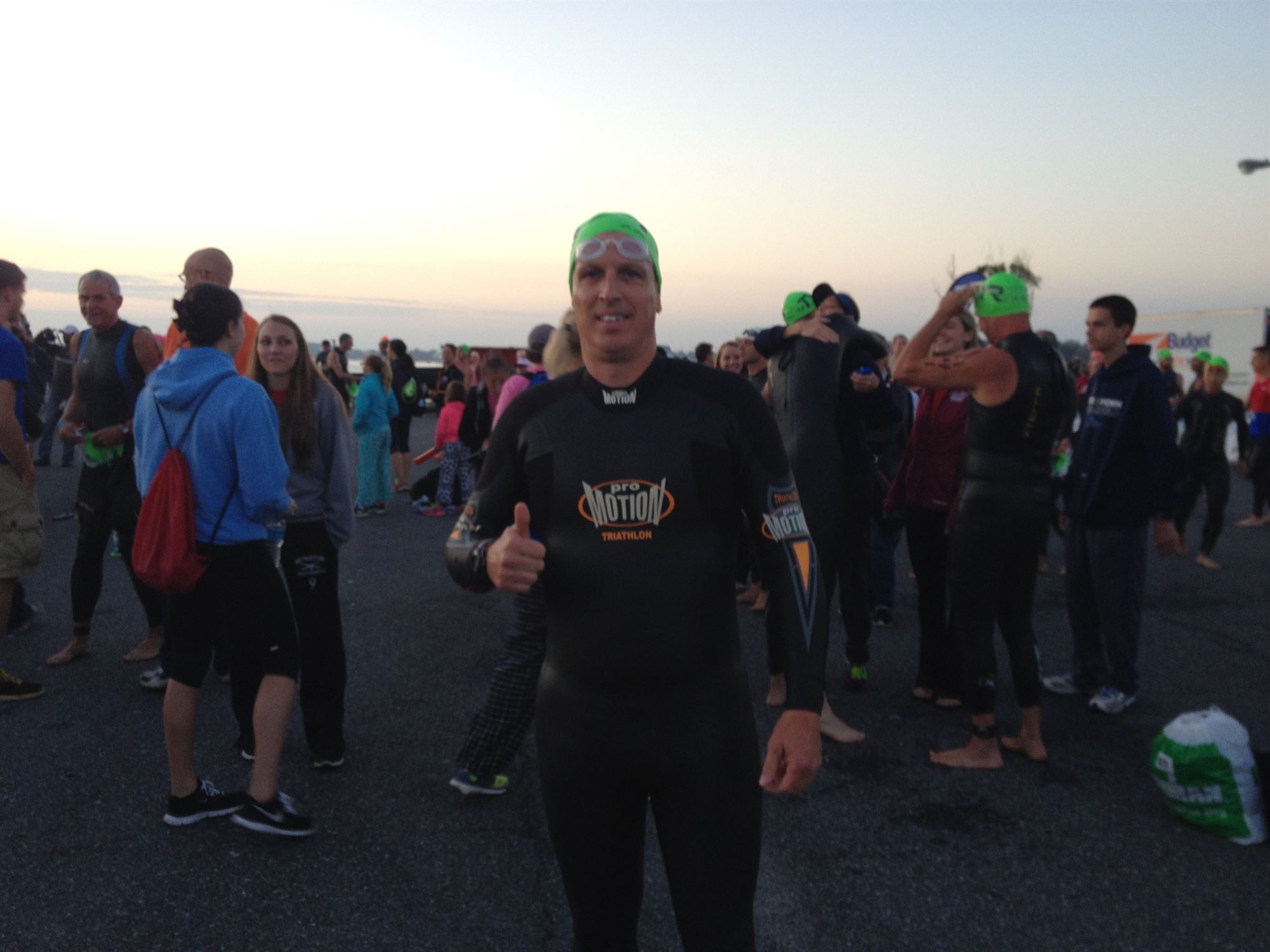 Stayed at the Holiday Inn Express, 10 minute drive to the event parking. 1 bottle of Gatorade while leaving hotel, to swim start. 1 bottle of water waiting for swim start. Used the bathroom before swim start and light stretching before and after putting on wetsuit.