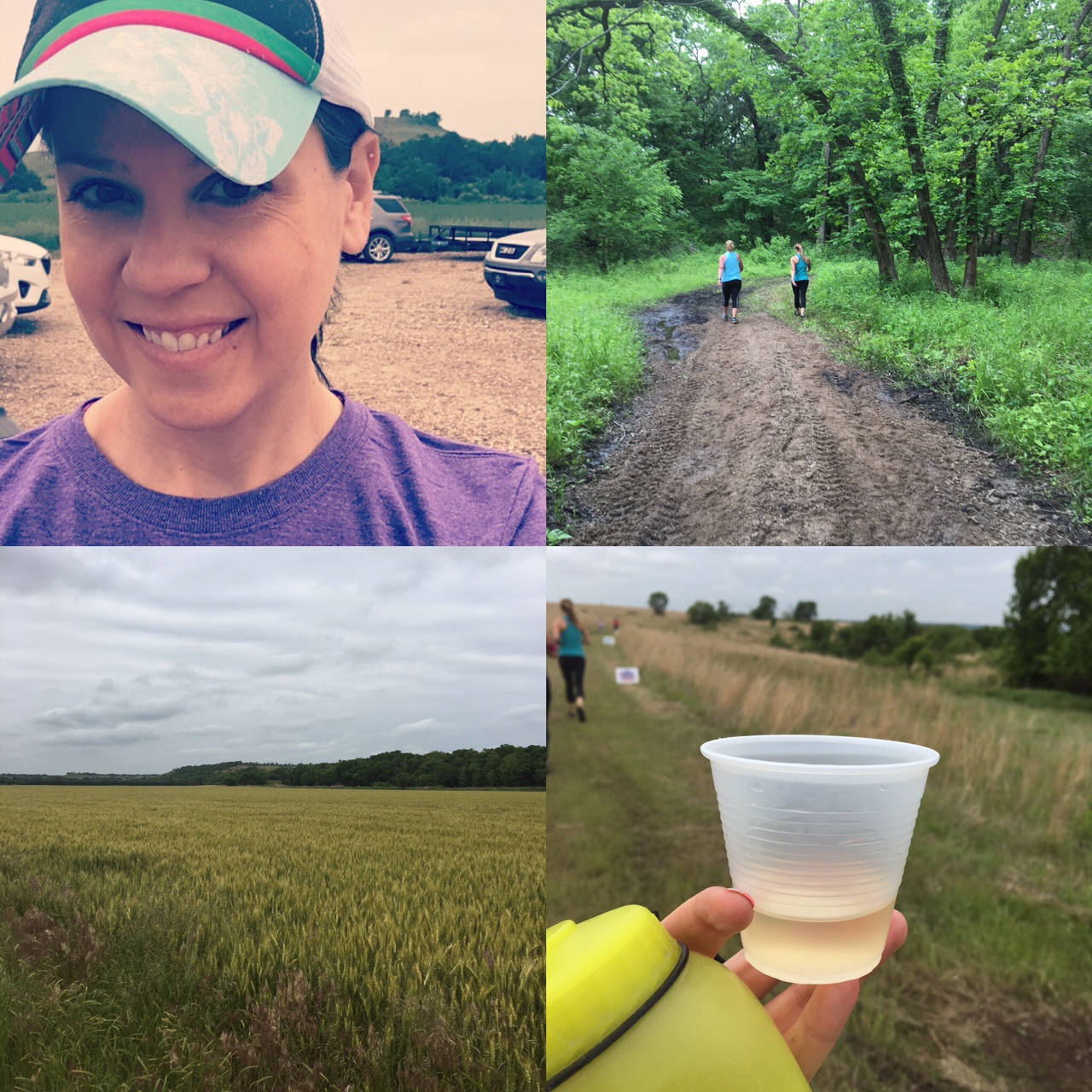 Comments: Super happy to see the forecast this morning was down to 10% chance of rain! Headed out the door at 8 a.m. and drove to Wheat State Winery south of Winfield. Off of the highways, this is a BEAUTIFUL area, I had no idea. Twisty, windy roads and hilltops. Picked up my packet and had an hour to sit around - ran into my friends Derek and Ashley from what feels like a former life. Ashley is sisters with Jen, who is now married to Tom - remember Tom ya'll? They live in Denver, but had come in for the weekend with their baby. Jen expertly avoided me, but I chatted with Derek and Tom for awhile. Life is funny like that. Started the race super pumped to hit a mental milestone for recovering from the IMLOU crash. A race. A real race where I start and finish without incident. In the first mile there was a flooded area we had to cross, then immediately up into a steep, rocky hill that had me gasping and heaving. But after that, it was gorgeous and fairly flat. There were areas with gravel, then rocks, then mud, and back again. And there was one more super steep hilly/rocky area where we did a little loop and turn around. But man I really enjoyed this run that ran through wheat and corn fields, the Walnut River, and back to the vinyard/winery. I did roll my (bad) ankle four times in the first two miles. I knew it wasn't bad, but it didn't feel great. I had to super pay attention to the ground and what my feet were grazing over to not hurt myself. I did end up with some chaffing/rubbing on my achiles area, and a bloody scrape on my shin - and of course MUD CAKED shoes. I feel like a real trail runner now :) There were four aid stations and two of them had wine - one white and one red. It was so lovely. Just little two-sip cups but how fun! What would you do differently?: Run on trails? ![]() Post race