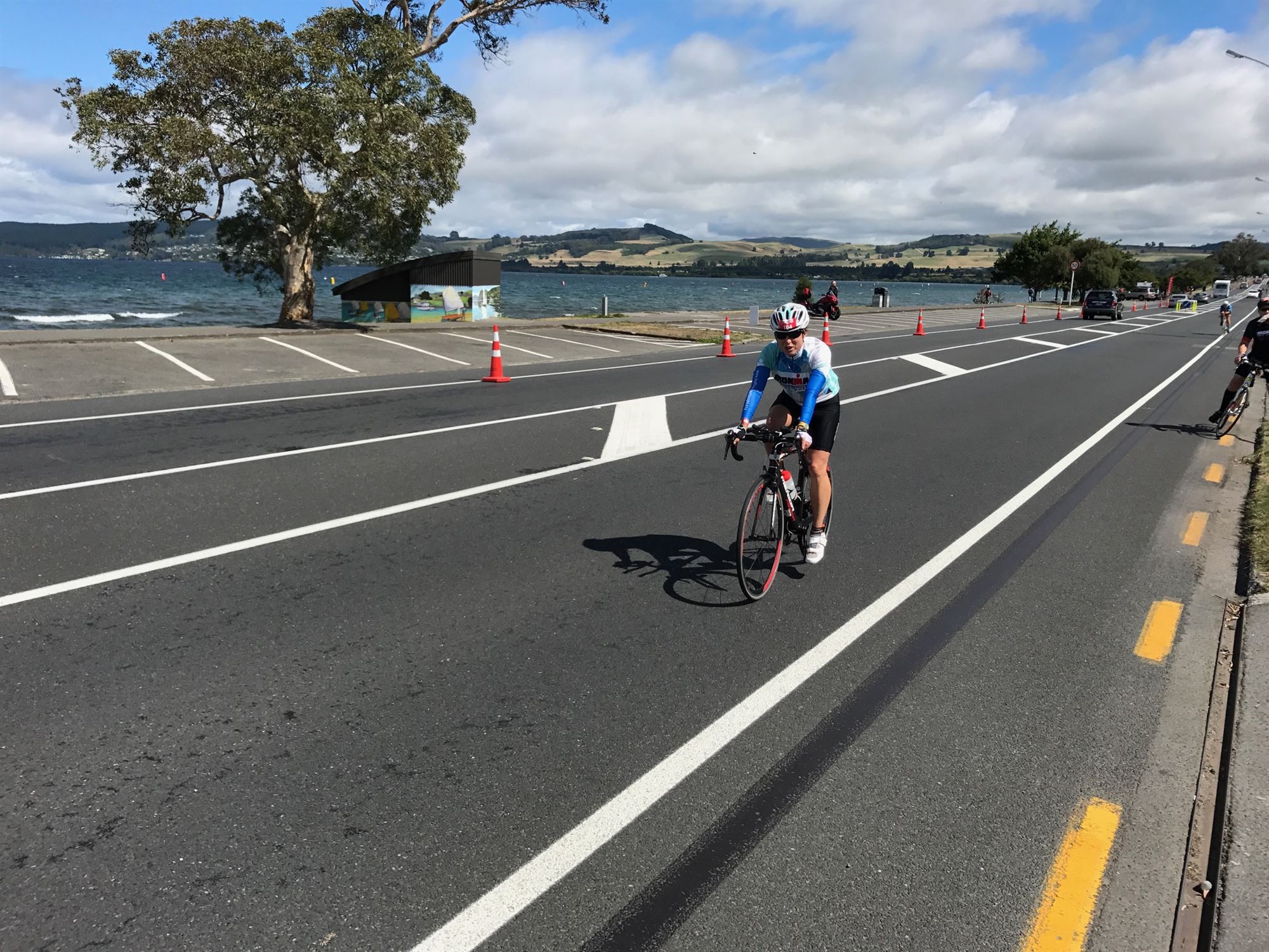 Course: Three lap to Wharewaka and back to town. There are a few small hills and the course is along the lakeside and through some residential areas. The support on the roadside is fantastic and really gives me energy to keep going.