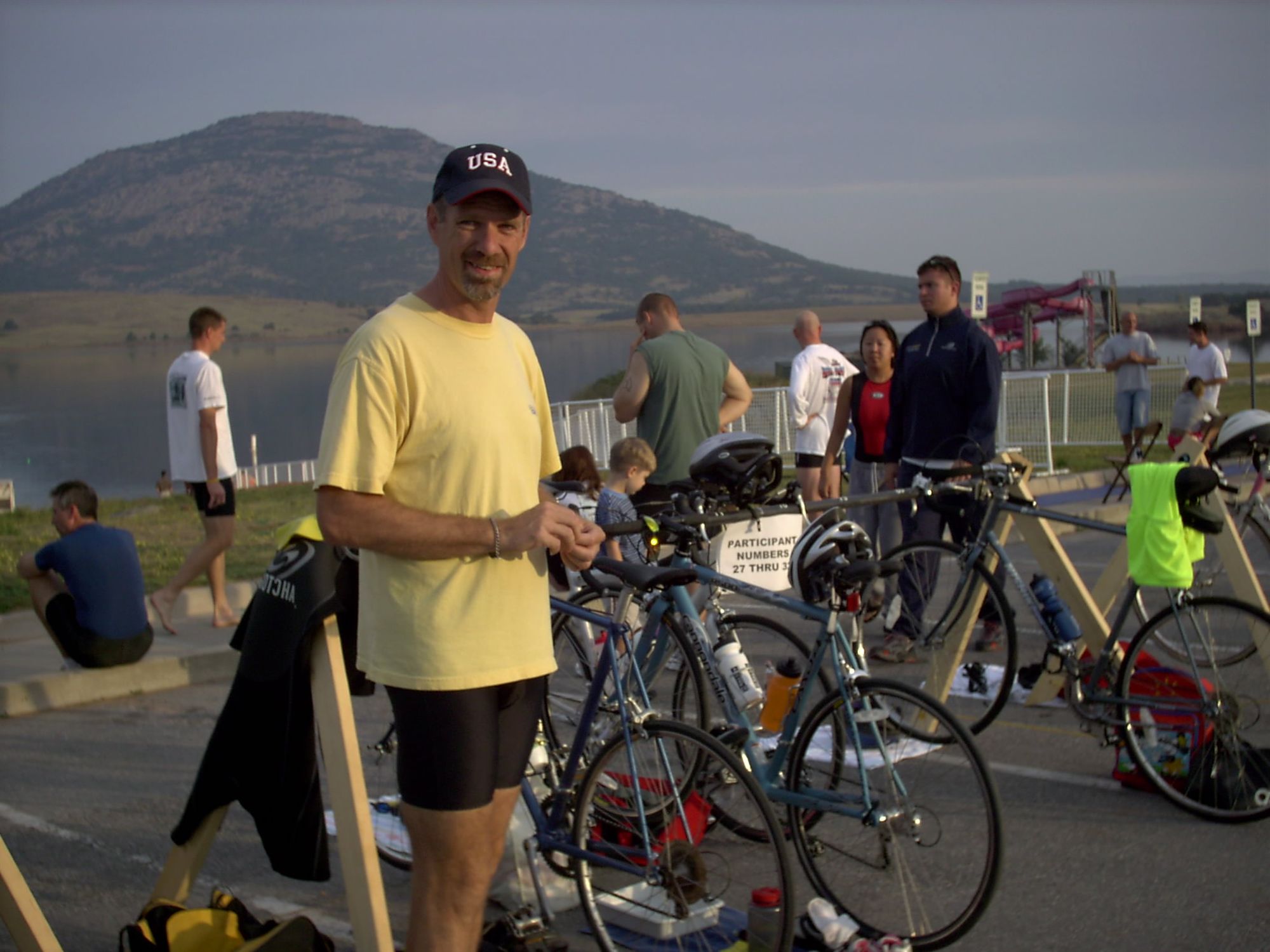 Very brutal run. After exiting the transition area there was a hill with about a 20% grade for a quarter of a mile. The other side of this hill was even steeper! So my quads were smokin' about the time I got down the other side. And we knew we had to run back this way to finish.
