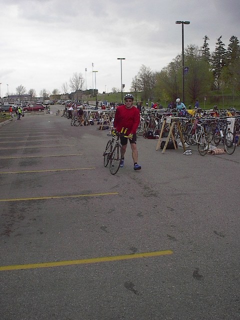 The Transition was not timed - T1 time is added to the Bike time. I estimate about 2 1/2 minutes. My socks got stuck while putting them on - I think because of wet feet.... I was able to put on my jersy while running from the pool to the Bike.