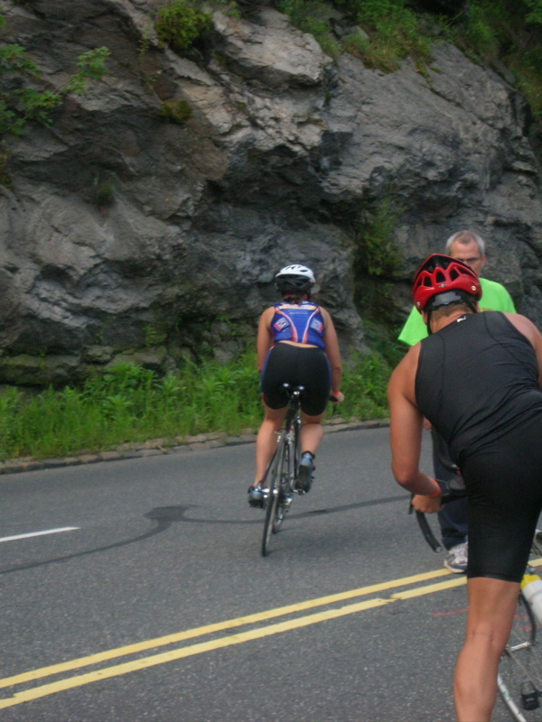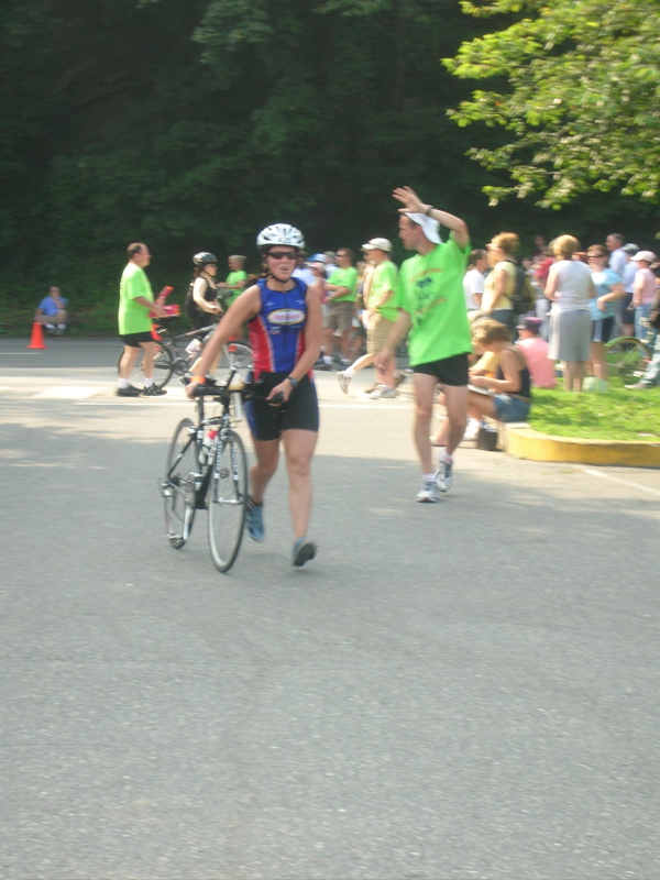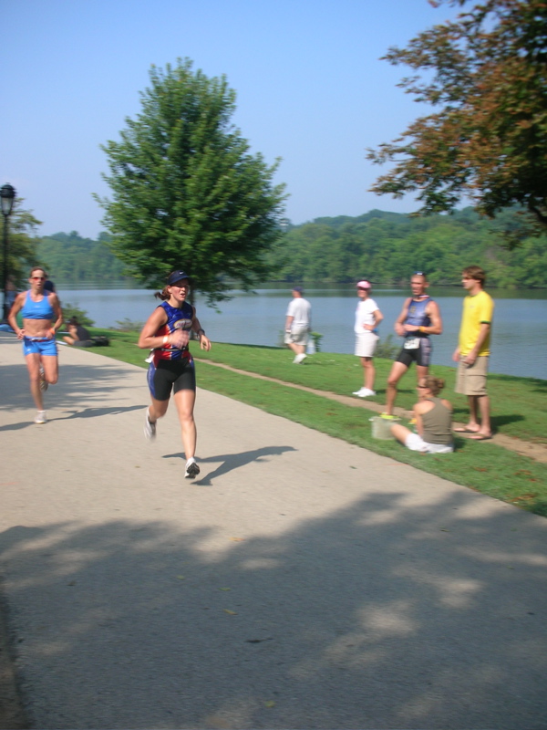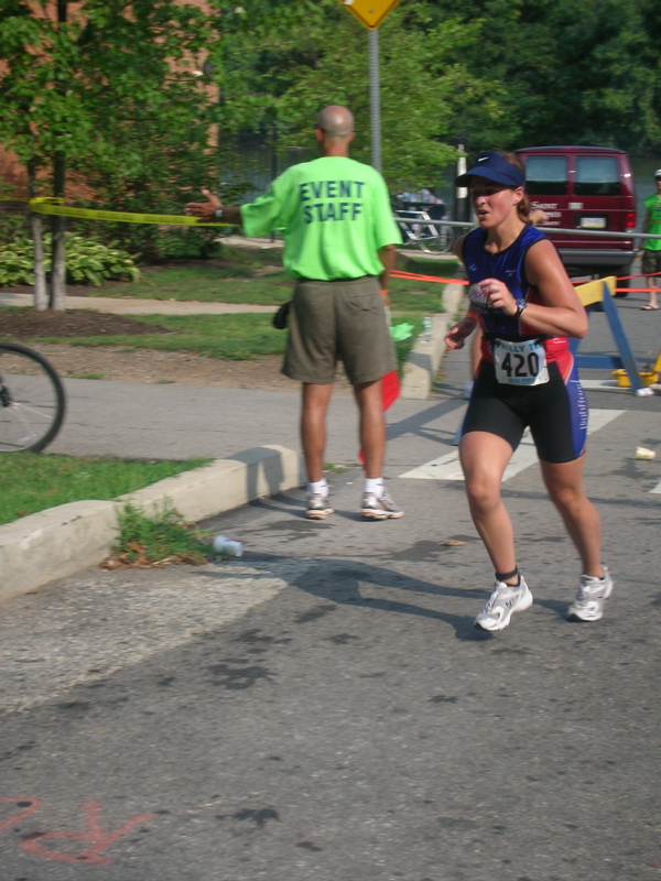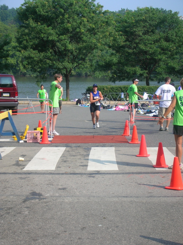 Comments: Self start, so I decided to be in wave 2. I wanted to get out of that water and onto the bike as soon as possible. Plus, I hate the anticipation of the race start when you are in a later wave. I jumped in to the water about 1 minute after the gun went off for the first wave, meaning I had to tread water for 3 minutes. Not so bad when you have the wet suit on, though. On that note, most people opted to not wear a wet suit, since the water temperature was 80 degrees. I figured what the heck, though, it'll give me an edge and help me out of the water. I positioned myself in the front of the wave. I started out closer to the back, but then I realized that I was (1) being a chicken sh** and (2) I wrote on my last race report that I needed to be a little more aggressive and position myself closer to the front. The horn sounded, and we were off. I had to maneuvor around a few men to break away, and after that, there was pretty much open space to swim in. My breathing was great, but my sighting wasn't. They only had 2 buoys positioned across the first straight-away. I relied on watching other people to hope I was going the right way. I started to feel a little nauceous at this point, and did one of those wet-burps-its-actually-puke in the water. Gross. Kept on swimming and felt another one coming on. This one tasted like my PB bagel. I finally rounded the first buoy and made the turn. Broke away from another cluster and found someone to draft off of. I used him/her until I made it to the next buoy, then passed them on the turn. At this point, it was a diagonol swim in. There were no more buoys on this stretch, which made sighting impossible. I just kept my head in the water as much as possible and treaded on. I was hoping I was swimming accurately. I passed a few more people so knew I was on the right track. I finally found the boat ramp we had to run up on and sprinted for the finish. Had some difficulty catching my footing on the ramp and struggled to get up. I looked at my watch and was stunned that I put up a strong time. What would you do differently?: Eat breakfast earlier. ![]() Transition 1