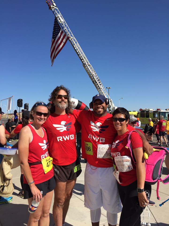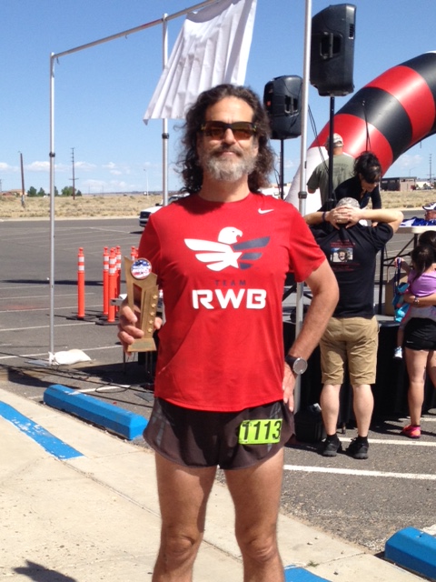 When the 5k people started coming in I went over to cheer for them. When the rucksack RWB guy came in I went up to meet him. Cliff. Super nice guy and an ultra runner. He and I cheered the others in and went to meet the other two RWBers when they came in.