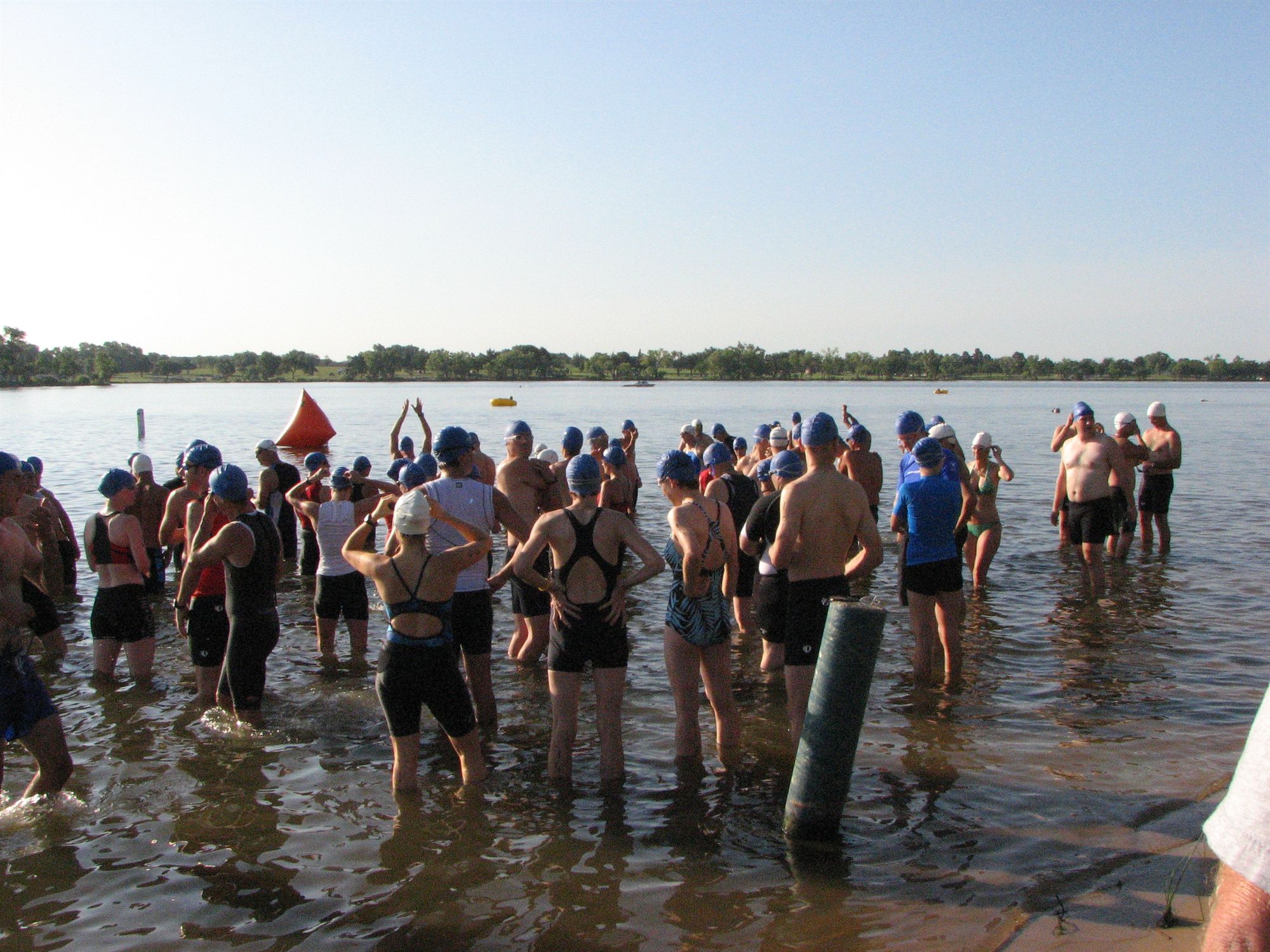 Woke up around 4am. Didn't actually get out of bed until about 4:35. After I finally got out of bed I ate my usual pre-race meal of a kellog cereal bar and a glass of water. Got all the neccesities rounded up and in the bag. Fixed myself a bottle of Gatorade to drink on the way. Was out the door by 6:15. Arrived at Lake Afton at about 7:25. There was only a few people there so I managed to get a good parking spot. Without many people being there I also got a prime spot on the bike rack!!! 2nd row, End closest to bike out.