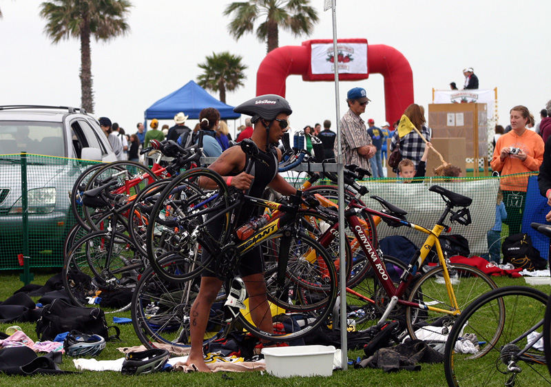 I took off my wetsuit on the beach because of the long run up a hill to T1. I knew that the suit would dry when I got to T1 so I took the opportunity to catch my breath and take the suit off. It also made it a lot easier to run in the sand.
