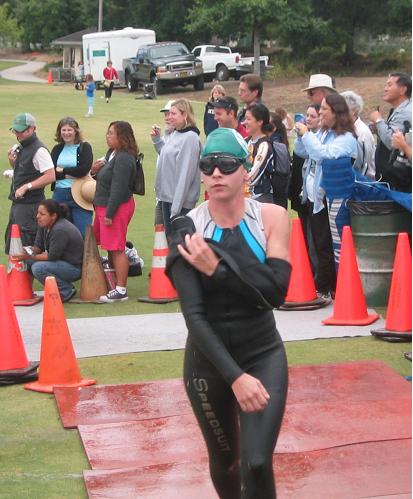 The first 1/3 of the swim went well, but then I think I got off course because there was no one to my right. Made it back on track eventually and got run over by the fast swimmers in the waves that started after me.