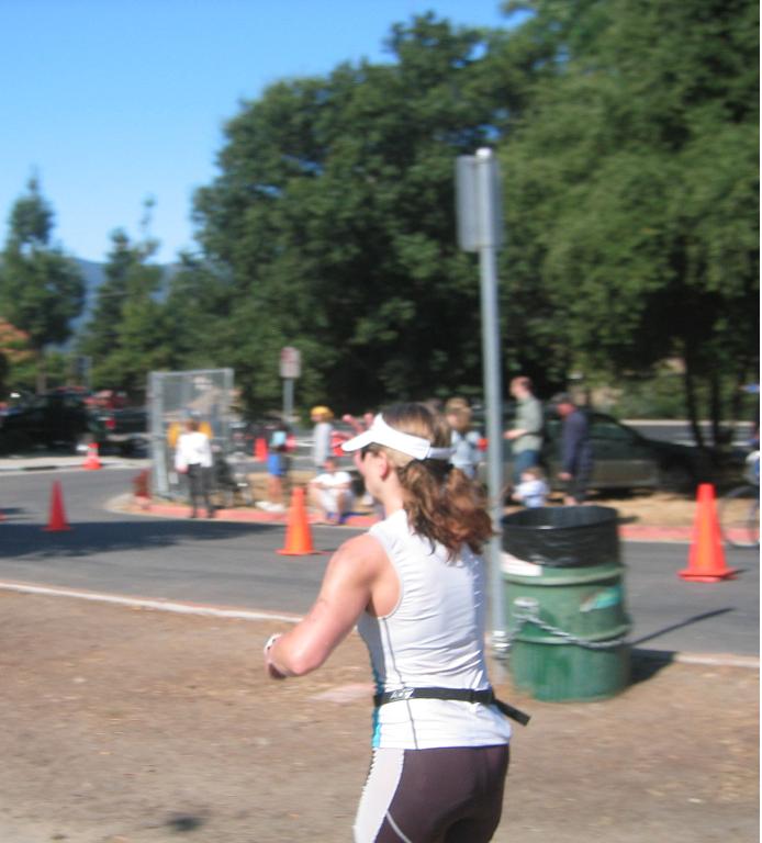 Gah! One of my neighbors left a towel over my bike rack (not a hang your saddle rack, a put your tire in between two poles rack). My bike ended up falling over. Other than that, it was pretty good. Bike shoes & Camelbak off quickly, running shoes on ok. Took my hat and number with me and put it on as I was running out of the transition area.