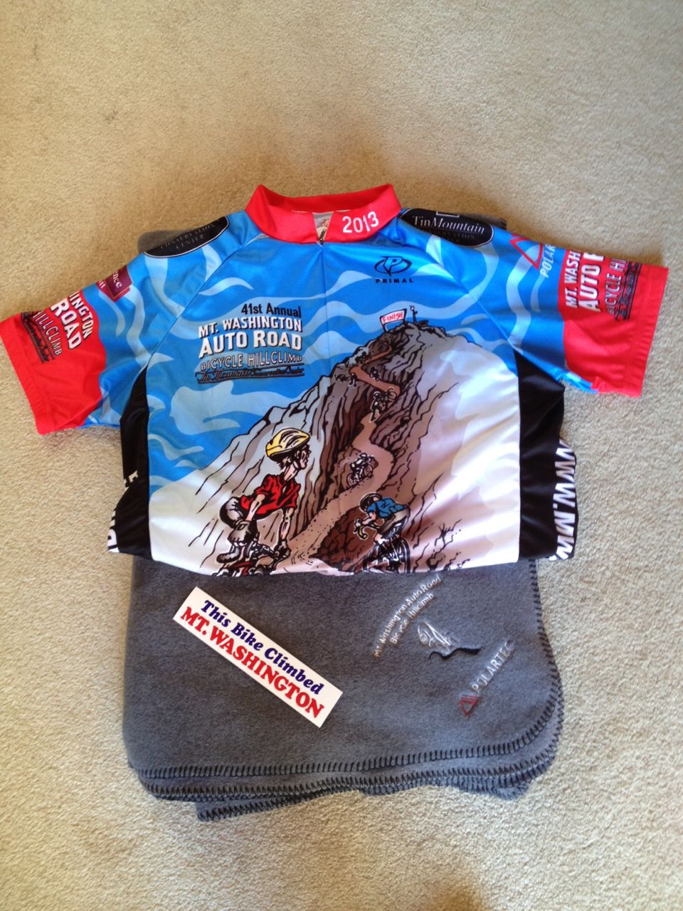 Warm down: I was happy to be done. It was a hard climb for sure, but I was a little surprised that I had felt in control for pretty much all the way, never felt that I was in danger of crumbling. But when I came to a stop my legs were a little unstable, though they recovered quickly. It was freezing cold at the top -- ~40 degrees, with ~20 mph winds -- unusually good conditions for that spot, so I'm told. For weary racers this presents an immediate danger of cold-related problems. I was so impressed to see that all racers were immediately wrapped in a thick Polartek blanket, a special Mt Washington Hill Climb edition no less. It felt like a luxury when I finished, but within a couple of minutes it felt like a necessity. I couldn't find Andrea and Zoe right away, so I started walking through the crowds below the summit in search of them. To no avail. I quickly learned that I had mighty sore hamstrings and a painful back, both from the unusual strain of keeping the pedals turning. A little while later I was able to call Andrea (remarkably good cellphone reception at the top of the mountain), and after some more searching we were able to find our car in the tightly packed mass of cars in the summit parking lots. It was strange to see all the cars like this -- tightly packed like on ferry boats, but surrounded by clouds and steep drops. Back in the car it took a long while to get warmed up again. We had to wait around for until about 1h45 after I finished before we could start driving down the mountain again. This time I was able to admire the views more -- amazing vistas -- and it was also very clear indeed why we were not allowed to ride down the mountain. There's just no way any sane person should attempt that. And even less reason for the world's worst bike descender (= me) to do it. When the results came out later in the day, I was surprised that I was as low as 22nd of 86 in my AG. But although I did pass most of the field on the way up, and was among the fastest handful from my wave, there were a lot of faster folks from my AG in the initial "top notch" wave. Anyway, no big deal, and I was happy with the time. I was entirely satisfied with my first hill climb race experience. What limited your ability to perform faster: Training and weight loss could have been better. I was right on the edge with my 34x32, and 1:1 gearing would have helped. Event comments: It's a wonderful event, and I'm so glad that I did it. Like other events that I like the most, the race is more against the course than against the other competitors. The setting is stunning, and the organization appeared to be flawless. Also the best race swag ever -- can't beat that thick fleecy blanket, plus a decal "This bike climbed Mt Washington", a variant on a commonly seen car decal in New England. The only downer is that the entry fee is as steep as the climb itself. At $350 for an event that lasts about as long as a half marathon, WTC race fees seem quite generous. But the fees support the charity sponsor, and since the ride always sells out in 1-2 days, I guess they charge what they can get away with. I'm not sure that I would do it every year at that price, even if I was living close by, but I'm definitely glad to have done it the once. Last updated: 2013-03-17 12:00 AM
