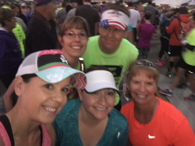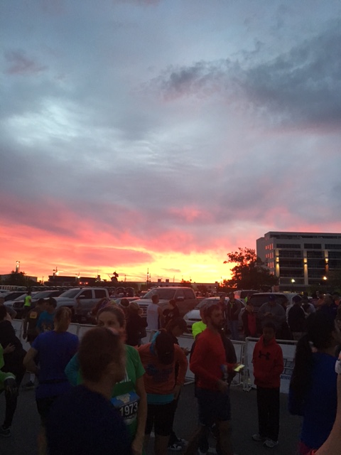 Up at 6 a.m. with a raw throat - thought it was just the chill in the air but writing this after the race I think I'm getting sick. Luckily it didn't affect the run! Parked downtown right at 6:30 and stayed in my car to keep warm for about 20 minutes. Headed to the Fleet Feet tent to meet up with my Start 2 Finish group and take pictures.