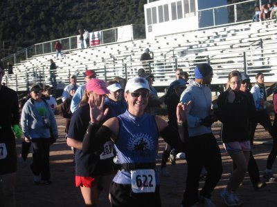 Comments: The gun went off and we slowly moved forward to the official line and started running. We hit a little dirt hill that led us up from the track to the road, and people started walking. I followed Niki’s line through the crowd and made it on the road where we could spread out. We wandered on some residential streets before finally hitting Dry Creek Road, which would be the main part of the race. My stomach was bouncing a bit, so I started in on the Shot Bloks at 15 minute intervals along with my water. As we ran, I realized there wouldn’t be any flat spots. The course was constantly climbing or descending. I knew it would be hilly, but I wasn’t sure how hilly. We didn’t drive the course the day before, and I figured ignorance was bliss on that one. With the hills and elevation I didn’t have a time goal. I told Zac to expect me somewhere around 2:20 or 2:30 finish time. My main goal was to make sure I didn’t walk. I would run really slow up some of the climbs, but I didn’t walk. This caused me to constantly leap frog the same group of people who would walk up the hills and then sprint on the downhills. Just before mile 4 we hit a really long downhill that got steeper and steeper. I was having a great time looking around at all the rocks and cruising downhill until I realized we would have to come back UP this hill at mile 9. Oh well, don’t think about it until later. I chatted with some of the other runners and met Tri Girl Colleen out on the course, who was one of the people I was leap frogging with. She had done this race the previous year and knew where the turnaround was. We turned off of Dry Creek Rd and I went on ahead. The hills got really rolling in this area. I kept looking for the turn, but everytime I figured it would be right up ahead I would see a string of runners in the distance. Finally we hit this crazy steep hill and I chugged up it, hoping the turn was at the top. It was, and Niki came into view as she had just passed the turn. Finally I was on my way back to town. I cruised down the steep hill and had to back off the pace a bit as my stomach wasn’t feeling well. I decided to increase the time between Shot blocks and drink more water to help my stomach empty. Later I started eating only half blocks to help. We made the turn onto Dry Creek Rd and I started getting ready for the big climb at mile 9. Sure enough, when it came into view, everyone was walking. Not me! I leaned into the hill and chugged along. It wasn’t a fast run, but it wasn’t a walk. I passed a ton of people on the hill and finally made it to the top. The terrain flattened out a little before the next small climb, so I used this to recover and let my heart rate slow a bit. I hit the mile 10 aid station at the end of the major climbs. Just 5K left! I kept telling myself that over and over. The last few miles on Dry Creek Rd were mostly easy downhill. Then we hit the turn on Hwy 89A and hopped up onto the sidewalk and started to climb again. This hill was a gradual climb, but it was still long. We had to stay on the sidewalk, which made it tough to dodge around the people walking. The course turned onto the residential streets again, and I was less than a mile from the end. Unfortunately there was a hill in the way. Of course, why wouldn’t there be? As I made the turn one of the volunteers yelled “one mile left” which made me mad because there was 0.3 mile left. Little things like that just set you off when you’re tired from running for over 2 hours. But I had a hill to climb. And this one HURT. The wheels were falling off the wagon at this point, but I swung my arms and powered up the hill. I hit the top and my heart rate redlined. The saliva in my mouth increased and came with the taste of Shot blocks. My body was screaming “Slow down now or I’ll make you puke and it won’t be pretty!” (As if puking is ever pretty). So I backed it WAY down but kept running. I wasn’t able to sprint to the finish, but I was able to run the entire way. I crossed the line and hit the timer on my Garmin to see 2:17. Wow! That was only 3 minutes slower than PF Chang’s last month. I couldn’t believe it. What would you do differently?: Train on long, steep hills. ![]() Post race
