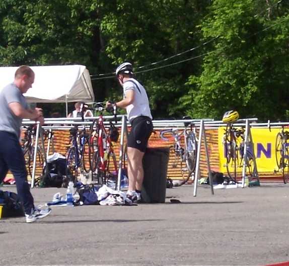 I threw on the knee warmers and took the bike for a short spin. I didn't measure it but probably about 1-2 miles. Then it was time to rack the bike and go inside. Some of the folks were warming up in the pool, but I skipped it. I didn't think there was enough time.