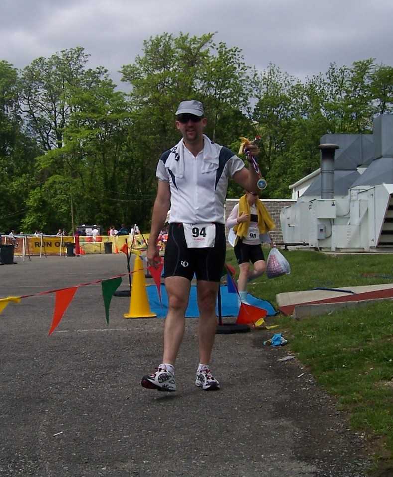 Warm down: Mostly I just walked around, found my wife, had some snacks, that sort of thing. We stuck around for the door prizes and awards, and to check my finishing time. I won a big bottle of Chocolate Hammer Gel and a flask. That was cool. I like winning swag. What limited your ability to perform faster: Swimming, core strength, and hill climbing. I'll get better at all of them as the season goes on. The hills were no worse than what I ride all the time at home - I just need to keep doing them. Event comments: Overall, I'm THRILLED with my performance!!! I had two goals, neither of which I had a chance of hitting. The primary one was a 1:30 overall finish - SMASHED that by 3-1/2 minutes!! The other was to beat tim_edwards (sorry, Tim!), which was a real challenge since he's a MUCH better swimmer than me, and pretty close on bike/run. I barely edged by him by 1:40, so having him to chase really made me push hard. My AG winner came in at 1:05:02 (7th overall), and the #6 AG guy was at 1:22:36, only 3:58 ahead of me... pretty darn good for my very first race, eh?? Only downsides (and they are small): The race started about 10 minutes late (don't know why), and the mile posts on the run were off. The free goodie bag had a Hammer gel, a sample of lotion, some electrolyte pills, and a FISHING??? magazine. But it was well set up, lots of helpful volunteers, good layout, and ran smoothly. I got a finisher's medal, a icewater-soaked souvenier towel, and a very nice T-shirt. Folks who did all 3 races in the series also got a bike jersey, but I only did one race. I had a VERY good time, and will probably sign up for this one again next year, if my schedule allows. It was a GREAT first race! Last updated: 2005-05-15 12:00 AM
