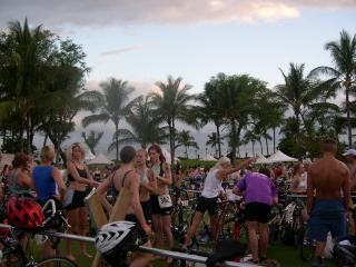 Eat bage, drink sports drink, eat powerbar. Set up transition & bike. Mingle with teammates and take photos.