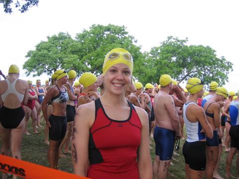 WokeGot up around 5 a.m., got lost driving to the race because of weird directions. Ate a Clif Bar and drank a bottle of water. Stood in line for the port-a-potty forever as we watched some dark clouds roll in and felt the temperature drop. There was an 80% chance of thunderstorms that morning, but luckily it didn't rain.I watched the first two heats of the long course starts and then it was my turn to go to the staging area.