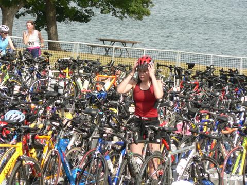 Comments: The swim was by far my strongest leg of the event. I was a little nervous about it being my first open water swim, so I purposely moved to the back of my wave because I had no idea how I would do. I ended up passing about half of the people in front of me. I also kept running into the bouey's, I couldn't swim in a staight line to save my life. For that reason I switched to the breast-stroke 3 or 4 times, and even did the backstroke for about 20 seconds. Only swallowed a few mouthfuls of lake water, but felt completely AWESOME about the swim. What would you do differently?: Start more towards the front of my heat. I could push it more on the swim, now that I know I won't freak out in the open water. ![]() Transition 1
