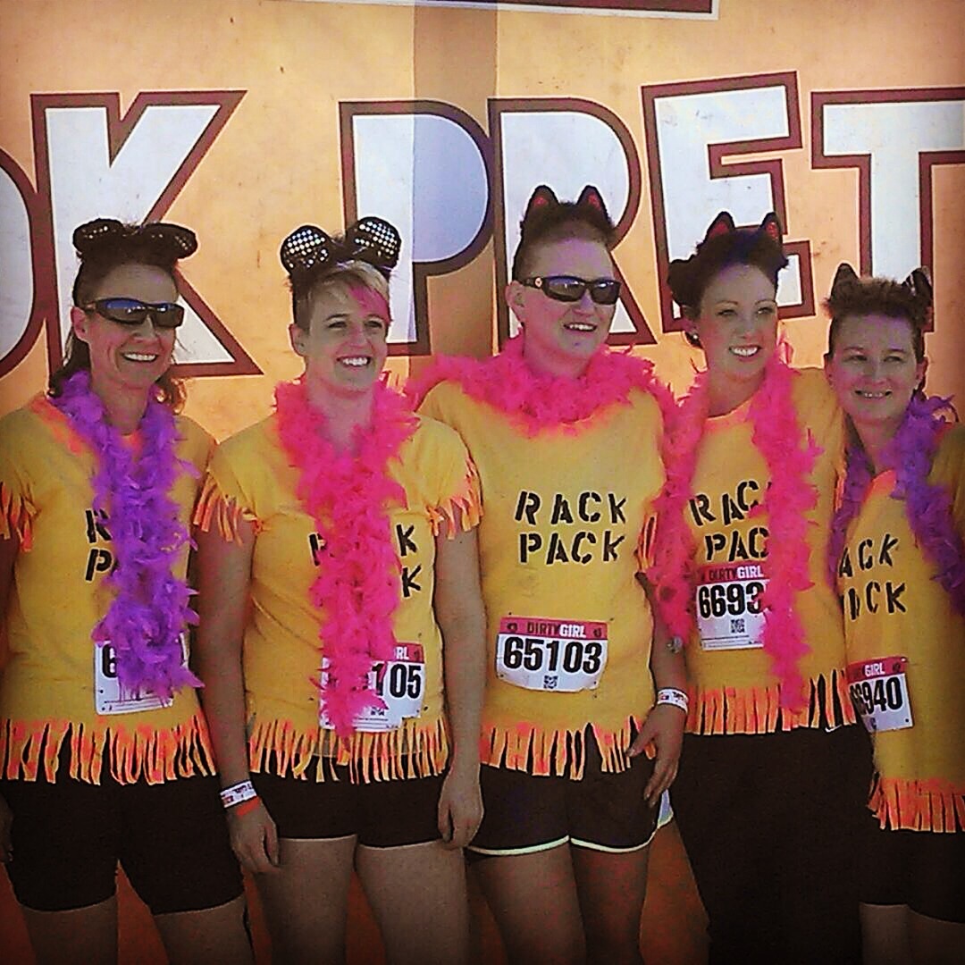 Once we got there we met up with my niece, A, and her SIL, E. We got in to our outfits. Shirt and socks by A, boa's by L, and cat ear tiarras by me. Then we pinned on our bibs, got our hair pinked and braided (for those with enough hair), posed for "before" pix and headed to the start line.
