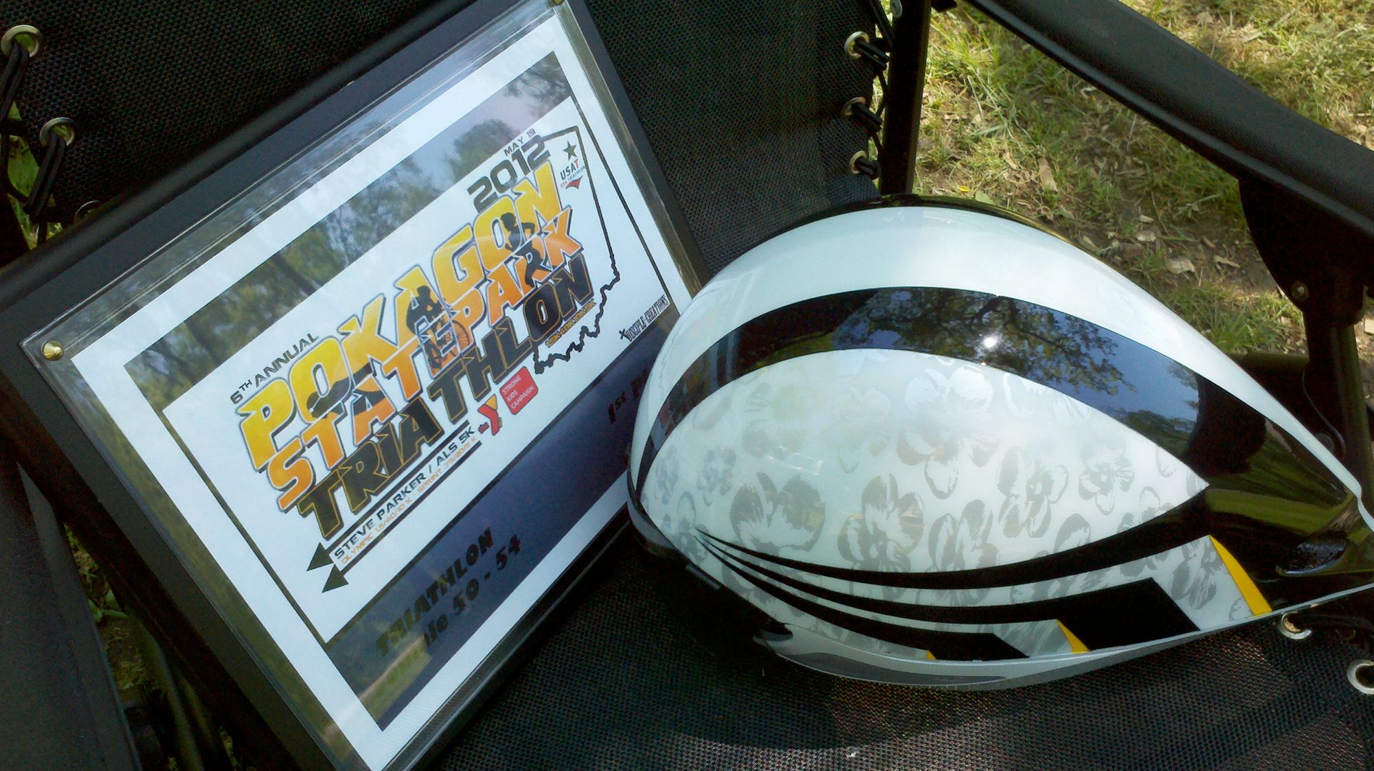 Warm down: Crossed the finish line and poured a bottle of water over my head/body. Chatted with Dirk who was eating pasta but I couldn't stomach anything right away. Packed up my transition area and stretched. Got a bite to eat while they were doing awards for the Sprint. Then they did some door prizes and I won a $50 gift certificate from Summit City Bike. Sweet! Found Dirk again and chatted some more. Then they started the Oly awards and called a friends name as 3rd overall male which made me shout out to him and I missed when they called Dirk's name as 2nd overall. That made me laugh and I was smiling from ear to ear for them both. I checked the posted results and saw I was the oldest female and the only one in my AG so I stuck around to get a really nice plaque. What limited your ability to perform faster: Heat, tentative with my knee and plain older age. However, this was my third year at this event and I bested my first year by 3 minutes and last year by 22 minutes - getting in under 3 hours - so I was happy. Event comments: I love the state park setting for this race. Camping and racing just plain make me happy. It's a very well organized race (started a bit late due to the pre-race talk going a bit long). However, it's not a well-attended race. They added the sprint distance and a 5K to add options. They've only had pancakes and strawberries for post race food in the past but this year they added pasta, bread, cookies and fruit which was nice. The RD came and sat with me at the beach on Friday and said he's hoping to turn the race over to someone else because he's done it for so long and is burning out. I sure hope someone steps up to the plate because this is a great tri season opening event. Last updated: 2012-03-24 12:00 AM