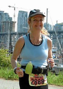 We had the clown, the Team in Training Guy in the fright wig singing and clapping as we ran by. There was a wonderful female barbershop quartet singing “Did You Ever Know that You’re My Hero”. As we entered Stanley Park an orchestra played the theme song to “Chariots of Fire.” One guy ran in a full American football uniform; helmet, pads, and all. Lots of dogs barked encouragement from the sidelines and kids called out to mommies and daddies as they ran by. Girls hung out upper story windows wearing red feather boas and cars honked at us as we ran over the Burrard Street Bridge.