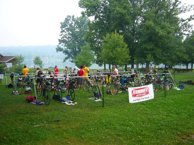 Even though transition is kinda filling up, there really aren’t too many folks here I notice. Talk about this to Tim and he said that he found there weren’t too many people entered. Too bad too, cuz looked like it would be a decent event with good weather.