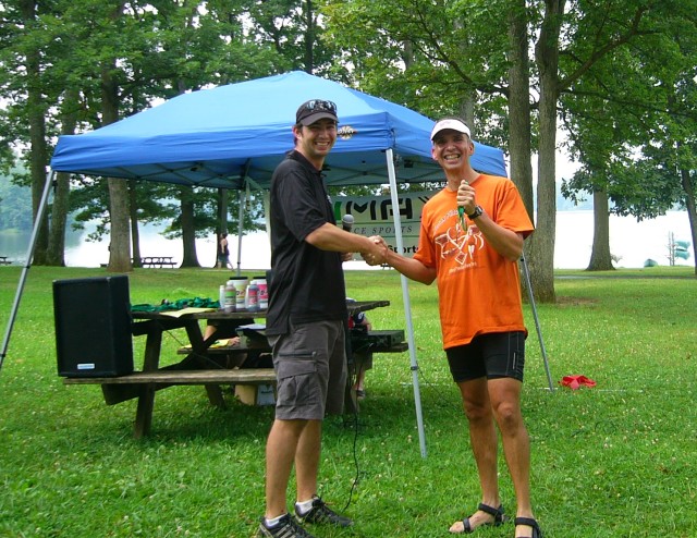 As we’re in the top third, Tim and I have finished quite ahead of a lot folks and there’s ample time to pack up our gear and load it back into the car. There are unfortunately no showers at this part of the park, so I headed back down to the lake and took a refreshing dip to get the sweat off me and cool off a bit more. As promised for post-race food, pizza has arrived and I decided to go ahead and have a slice. This might’ve been a mistake as I was having some sort of digestive problem later in the evening. I really don’t care for pizza after a race as it just doesn’t really do my innards well when I’ve put forth that much effort. After this, Tim and I stick around for awards and raffle prizes (didn’t win anything this time). We took turns taking pictures of each other receiving them.