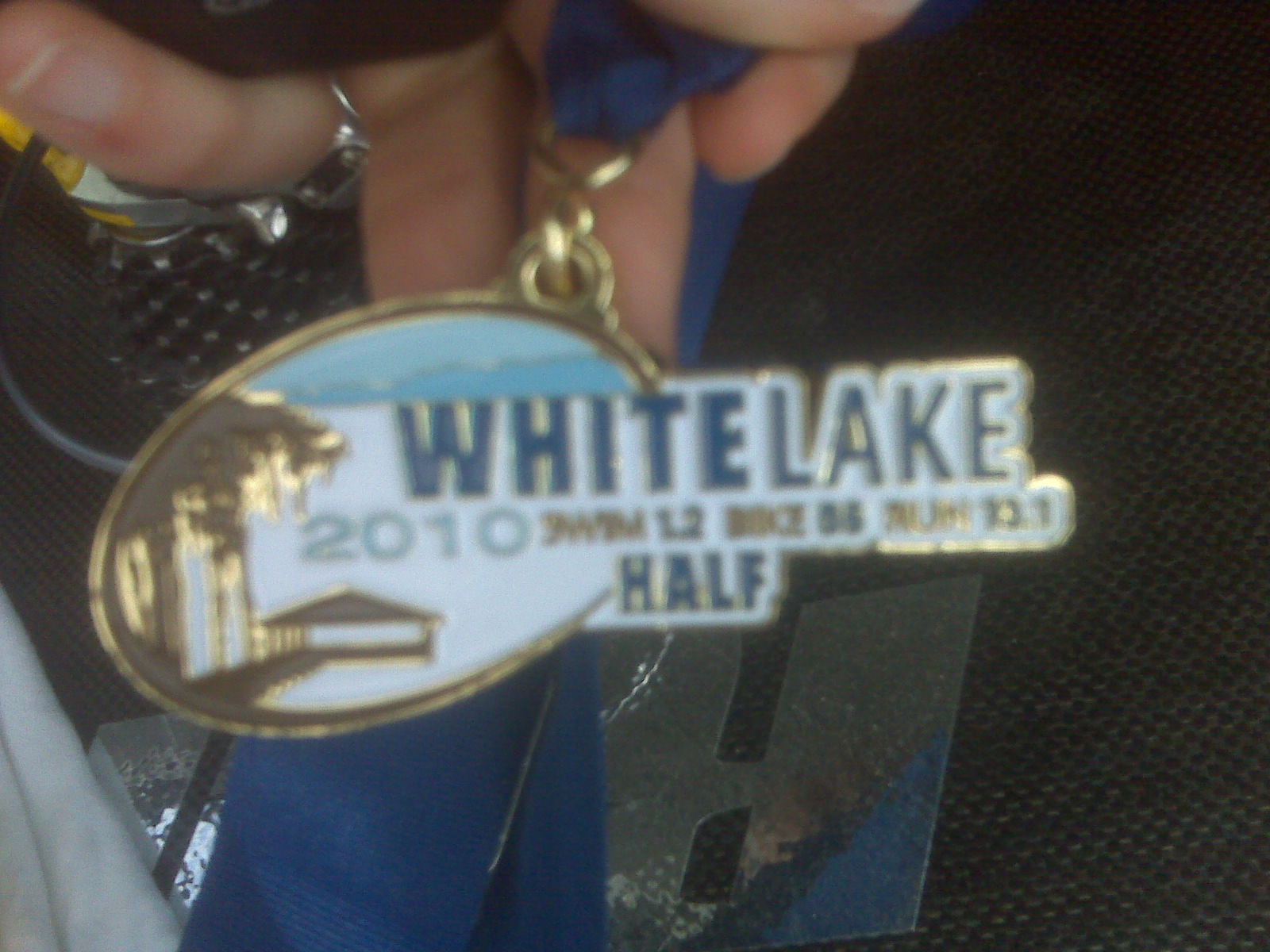 Warm down: I grabbed a bottle of water and a bag of cookies because I knew I was going to feel very sick otherwise. I walked back to see Janelle and Jon, we chatted a bit then I went to transition to change shoes and use the porta potty again. I started feeling off so I walked back to the food area, grabbed another bottle of water and some Doritos, maybe I needed salt not sugar? I inhaled the chips and sat in the shade for the bit, I had a good spot so I could see people coming in and I was hoping Scottie wasn't far behind. I thought about jumping in the lake (something I was dreaming about on the run) but I was getting cold, probably due to dehydrated and the sunburn on my back I later discovered. Sitting here typing, I wish I would have stretched more because I am already really tight! What limited your ability to perform faster: The crappy swim start for me and the heat, my god the heat! I think I am just not used to running in the heat yet, I did long distance runs in August last year and was fine but I just don't think I am used to it yet this year. Event comments: Good race, mentally tough due to a boring bike course and the crappy run. The lake is really beautiful especially in the morning before everything starts. The race shirt was kinda crappy, it was red and hard to read the writing, I would have loved a nice blue/green/grey shirt to match the serenity of the lake :) Though the socks were better then Pinehurst...such a diva I am! Last updated: 2010-05-01 12:00 AM