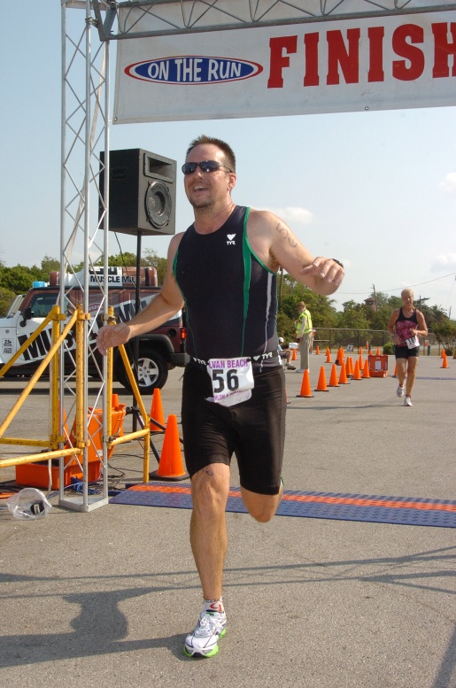 Warm down: Walked around, got my BYOB and some pizza, waited for my wife to finish her du. Talked w/some other racers. What limited your ability to perform faster: Lack of training, duh. I could do each distance competently, and had done them back-to-back-to-back in training, but it was not enough to get into the middle of the pack. To do that in longer races, I will have to work much, much harder. BUT, there's a caveat: I did beat my goal time (2:20). I almost hit my "secret" goal (2:15). My swim and bike pace were not far off my sprint pace. My overall time would have been EXACTLY MOP in last year's field. This year my AG doubled over last year, and over half of the "new" finishers beat last year's 1st place finisher. The fast end of the field just got incredibly deep. So, while I am disappointed that I was so far back (part of why it took me 4 weeks to write this report), I have to temper that w/the fact that I met my time goal in a new distance. Even better: I learned that to survive an Olympic in August, I will need to work very hard for the next 2 months. Event comments: Jana (Tri-On-The-Run) is a great Race Director. Her races are well-organized, friendly, and fun. I would like beer at the finish, but that's not for everyone, so I BYOB and I'm happy. She does give us ice cream, after all! Last updated: 2011-07-08 12:00 AM