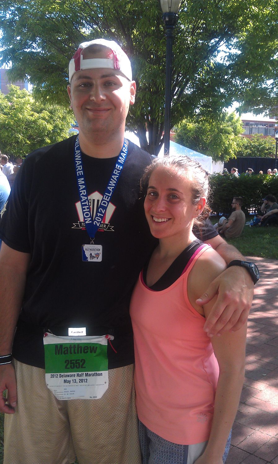 Comments: This race was alot of run and I feel that the RD and town did an excellent job. When the race started, it was a nice and probably in the 70's; perfect race weather. The gun went off and me and Jenna started in the middle of the pack. The goal was to start off slow and run like an 11 minute mile pace just to save some energy and set a good pace. Once we reached the first mile marker, we ran it in 9:20 so our plan was over before it actually started. The frist 3 miles were flat and took us around the Wilmington Riverfront area. We passed through some shopping areas but mainly stayed along a path by the water which was real nice. This area was also decently shaded but did expose us to some sun. At mile 4 we made our way into the Brandywine Zoo area. This area was completely shaded and crowd support was nice. There was a guy who was on the side of the road playing drums for us and alot of people cheering. The roads were paved well but this is the section where we started the hills. I really like going through the Zoo, it was quiet but really nice with the shaded roads and all the water. After a few miles in the Zoo, we made our way out and ran up a very large hill that I thought would never end! this section took us into the town and we ran through some neighborhoods. At this point, the sun was out in full force and it was not as shady as the Zoo. People in the neighborhoods were friendly and some posted some pretty funny signs on their lawns. After that we went through the "Little Italy" section of town (or lack there of, I am from Baltimore and we have a nice Little Italy part of town, this was maybe 3 pizza places and it wasnt that great). Up and down a few more hills, back into some neighborhoods and then we made our way up another really long hill into the downtown area where we went up another long hill and then all downhill to the finish on the river front. What was really cool to see was that when we were about 5k out from the finish, the cops on the motorcycles came by us and were escorting the Marathon leader by us. So even though a guy finished a marathon before I finished a half, which can be a little demoralizing lol, it was cool to see. I would say that this course was very nice, scenic and pretty well shaded but it was definately HILLY! When I did Annapolis in November I thought that was bad but this was way worse then that race. Crowd support was great and the Volunteers were amazing!! This race had plenty of water and gatorage stops, splits at miles 1, 5 and 10 and just alot of athlete support. What would you do differently?: The weather for this race was about 40degrees hotter then the last time I raced a Half (November) so I think I needed to drink more water during the race because I felt pretty dehydrated afterwards. I think my nutrition was spot on (Gu's at miles 6 and 10) and gatorade every other water station. I think I would train for hills more if I were to do this race again but overall I am super happy with this race and my performance and I scored a 7:00minute PR on a tougher course! ![]() Post race