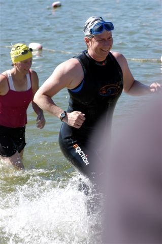 Comments: OMG, what a great swim! NO PANIC! NO OWS FREAKOUT! Felt easy and relaxed the whole way. The water was green and murky so that I could hardly see my hand in the water - and NO claustrophobia! What's happened to me? Last year at this race I did two - count 'em - two strokes with my face in the water - first one eyes closed, second one eyes open which started the whole OWS freakout thing -sidestroked the rest of the way. This year, swam easy, straight and relaxed the whole way. I started as far left as I could but still got caught in the crowd. Got kicked in the side a couple of times by people breaststroking (ouch!) and saw a couple of whip kicks go by my face - so glad they didn't connect! Finally stopped, swam outside everyone in the wave and was able to get into a rhythm. Used a trick learned right here on BT to start outside the group and breathe on the side toward them - as long as you're staying about the same distance from the crowd you're heading in the right direction without so much sighting. I swam a little farther by doing this, but it was well worth it to not be running into people. Another OMG thing - I swam pretty straight - every time I sighted, the buoy was right where it was supposed to be. I was ready to turn at the orange buoy but the turn was one more buoy out at the green one. Darn. Still, no panic! Yay! After the second turn, I got sort of disoriented - I sighted, didn't see where to go, sighted again, sighted again...finally had to pick up my head out of the water to figure it out. Thanks to the kayaker who pointed me right! Swam in and kept running into one other in my wave, but started passing people from waves ahead of me...another Woo-Hoo! Swam until my hands touched bottom (still couldn't see it! Ewww) stood up and ran to my bike. Saw the tri-brother with his camera as I came out. This is the first time EVER that I've been able to run after a swim. Woo-Hoo! What would you do differently?: Maybe get outside the group earlier... otherwise this swim was a victory in itself!  Transition 1