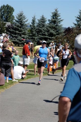 Comments: The start was uphill (ugh!) and people were weaving around. I remembered to put the bike in the right gear to start, but I can't do the running start and I couldn't get my foot clipped in. In my old MTB shoes, I would start riding and clip in when I got the chance, in the tri shoes I don't have that option as they slip off the pedals. Slipped off once and jarred everything including my fillings, but clipped in the second time. Heard the club yelling again (thanks guys!) and was off. I had an awesome bike ride! Got passed by only two people who I then passed back and didn't see again. I was continuously passing people - one of the advantages of starting last, being a slow swimmer and being fairly strong on the bike. :) I moved from 64th place to 39th place overall in this portion. I have to enjoy this during the bike leg 'cause I lose all advantage on the run. :) The biggest problem for me was that people were not riding to the right. There were multiple people ignoring the wide bike lane and riding on the road, which was NOT closed to traffic. I only passed on the left, but had to go way wide in a lot of cases. They'll need to remind the riders in the pre-race meeting next year. I stayed aero most of the time (I have a roadbike with clip-ons) except for climbing, when I had to sit up a bit. Rode hard but managed to stop short of blowing up a couple of times. Best race ride to date! What would you do differently?: Figure out how to get clipped in quicker.  Transition 2