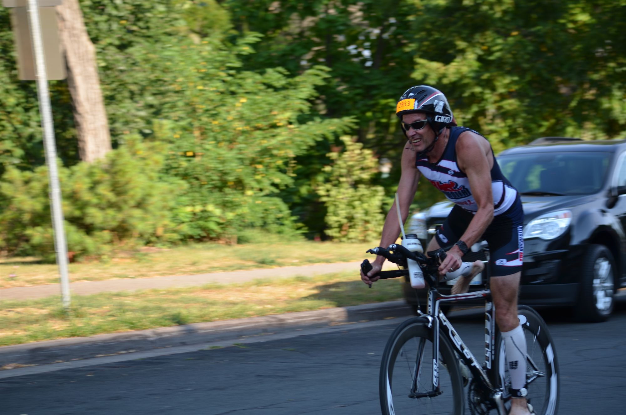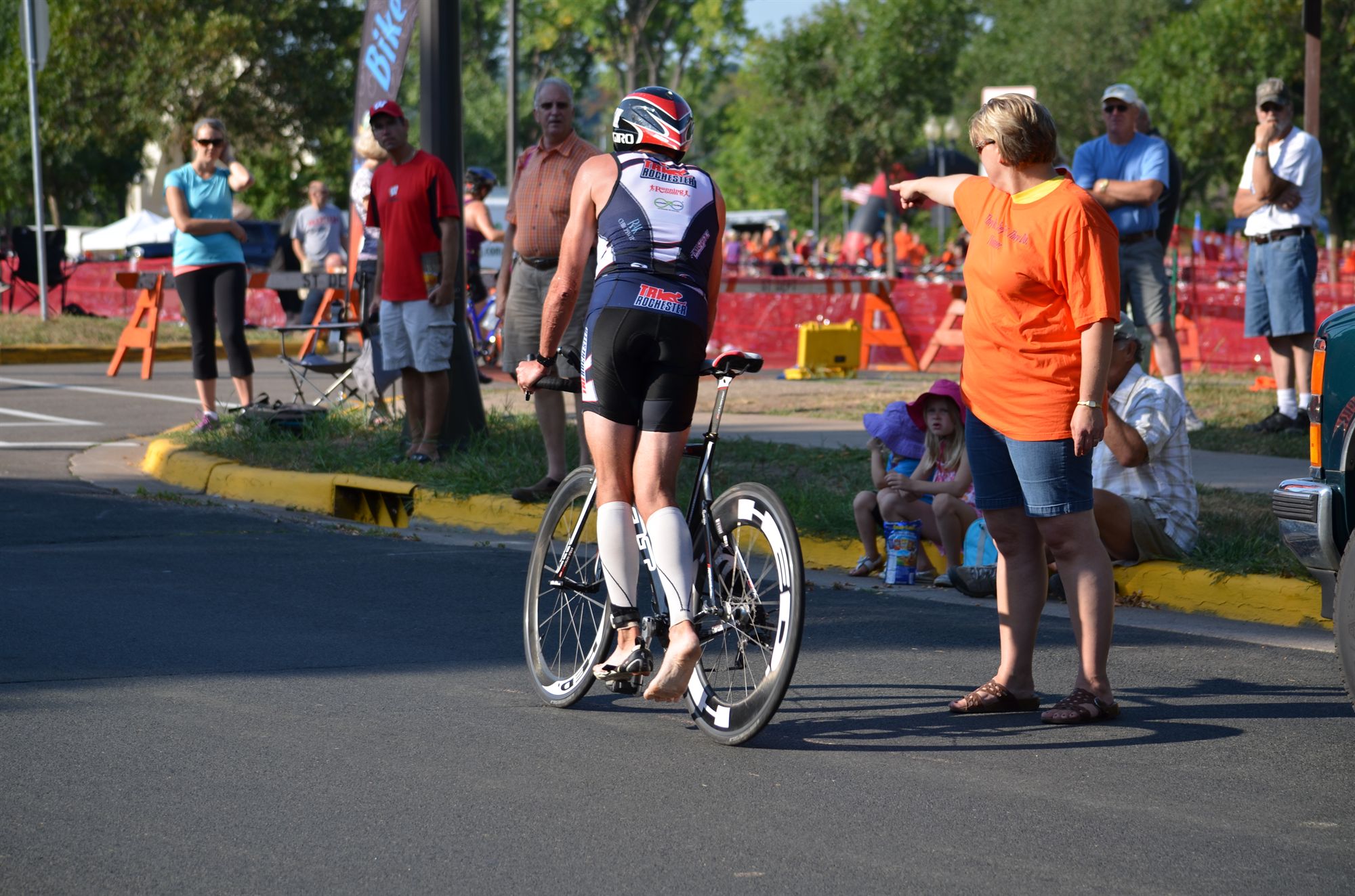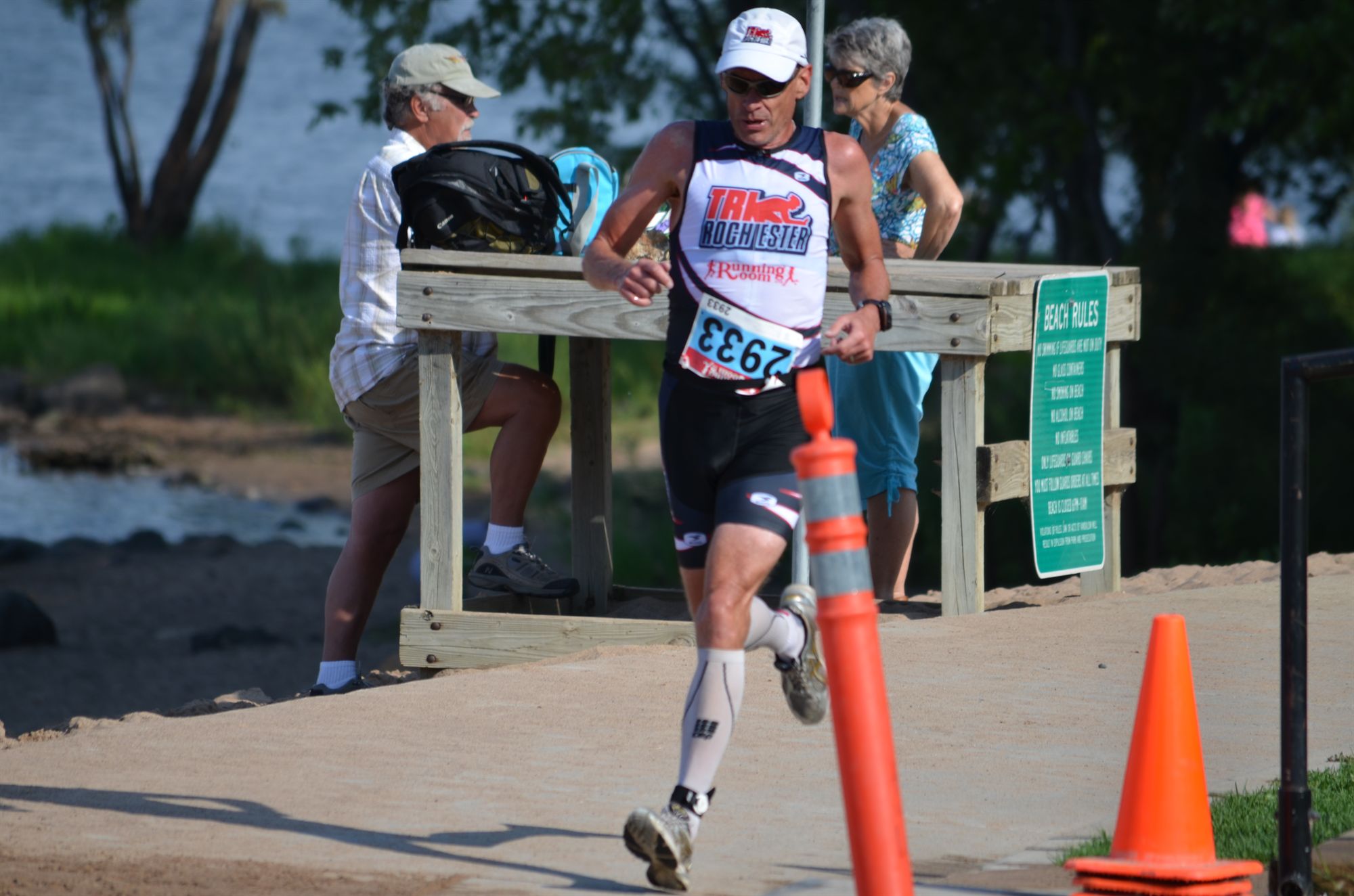 A little over 2 miles on the bike, checking out the start/finish of the bike course. A short run, and stopped to pee and the zipper broke on my 1 piece tri suit, just like at RochesterFest. I was ready this time and had a 2 piece in the car so I ran there nad changed. My biking sun glasses also broke before my warm up ride but I had extra sunglasses in my pack. Short warm up swim during the pre-race meeting.