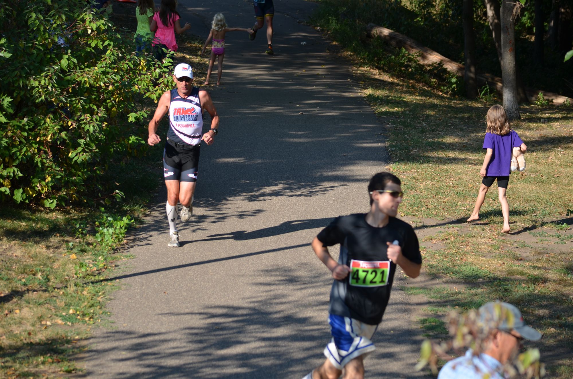 Warm down: Plenty of fluids, the run was hot even with the shade. Ate the post race food, waited for awards and prize drawings. What limited your ability to perform faster: See run comments, I think I need to push myself harder, especially on the run where it gets to be more mental as you get tired and want the race to be over. I also went into this race knowing it was a small field and I should win my AG unless someone unexpected showed up. I may have slacked a little vs knowing I was up against known fast guys. I was 11 seconds slower than at Milwaukee 3 weeks ago. I thought with a smaller transition and better lead up training I would beat my Millwaukee time. Water was much warmer here. Bike courses were similar with one decent hill but Milwaukee had a flatter and easier run course. Mexican food pre-race is now 3-for-3 in AG wins Event comments: The awards dragged a little at this one but Jerry did a good job. Not a lot people hung around and it was a small race to begin with. Pics #1 - pre-race #2 - start of bike dismount #3 - ready to run into T2 #4 - start of run #5 - end of run Last updated: 2013-09-01 12:00 AM