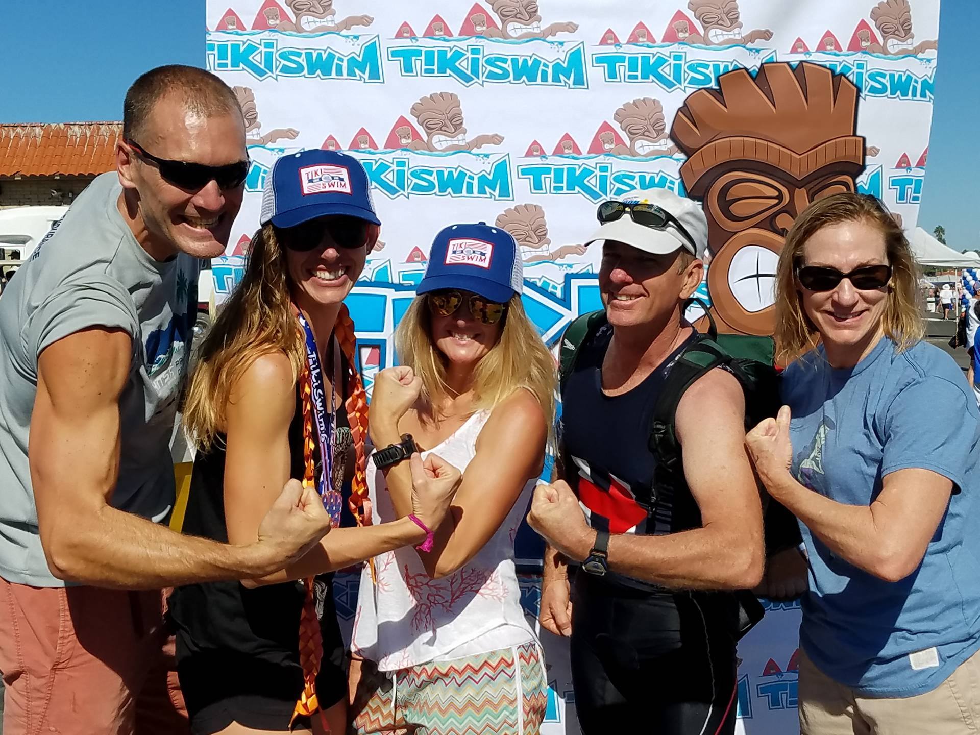 Comments: The beach was beat up from a recent storm, and the entry was rocky. The current toward the pier was stronger than usual, and the surf was running in sets from almost flat to about 6'. I got wet just before the gun and saw that the entry was tougher than usual, so at the gun, I took it slow getting into the surf. This created a problem ;) The starter tried to time the start between big sets, and when we went in, the waves were okay, even though they were breaking in shallow water with a rocky bottom. I got through that okay. Then a set of rogue wave came from nowhere. The first one sent me tumbling, under for a long time. When I came up, I was looking at a wall ready to break and had to place faith in diving under and dolphin kicking until it was past. I remembered as a kid in SoCal that big raves run in sets of three. Wave three was big, and so were a couple more. Talking with spectators after the swim who were there for their super star kids, what they saw was that the lead swimmers were okay, and that everyone else got nailed as that big rogue set washed them back to the beach, and a few more sets made everyone work to get away from the beach. The spectators said a few dozen people quit when they got nailed. The conditions were way too much for rookie open water swimmers. That first rogue wave was more than I've seen in years of ocean swimming. When I finally got out of it, only to see another wall crashing at me, I wasn't really swimming, but trying to catch my breath. My buddy Lauri described the same thing, that the waves were so tough, she couldn't catch her breath - we didn't know if we could make it, but we both did. The waves stopped breaking two or three hundred yards off shore, and the rest of the swim was merely challenging, with just a little chop, and swells that made it hard to see the buoys. The swim felt good, and I knew I was a lot faster than ever. I kept hoping to draft, but I guess I needed a faster start to be with swimmers to draft - I kept passing everyone I tried to draft, so I probably needed more adrenaline at the gun to be with faster swimmers. Most of the swim was like previous years. It was a little long at 2.55-2.6 miles depending on the Garmin, but it was slow. My only real goal was to be faster than in Tiki Swim 4 when I was 70% back at 1:31. Since this time I was 53% back at 1:37, the race was a lot slower than my last one. But I crushed my goal of finishing better in the field! The one trick I planned, mostly for fun, was to do the fly at the finish. My coach in Palm Springs who started me on the butterfly goes to this race, and said three people did the fly at the finish last year. I knew he was on deck at the finish this time, and I did the butterfly up to the turn and up the boat ramp for the final 50 yards. I did a few strokes of fly at Oceanside 70.3 this year for fun, and looked around to make sure no one was near, but this time, since I knew my fly was almost as fast as my freestyle, and I can easily stay out of the way when we circle swim at masters, I just did it with other swimmers nearby. Mission accomplished. A solid challenge, a lot of fun, and fun with great friends. After the race a bunch of us from the desert got to chat and enjoy the stuff after then event. We got some great pictures. I went with my Neosport sleeveless this time, but would probably have preferred my 19 sleeveless. I got a little bit of wet suit burn with the Neosport. The water was just warm enough for a sleeveless - at about 67 and below, a sleeved suit would be better. One cap was perfect. What would you do differently?: If I could have seen into the future, I would have run hard into the water like in a tri to beat that rogue set that came from nowhere. It also would make sense to pace off of faster swimmers for the first few hundred yards to have someone to draft. But I can't complain. I'm totally happy finishing half way back in an awesome SoCal field like this. ![]() Post race