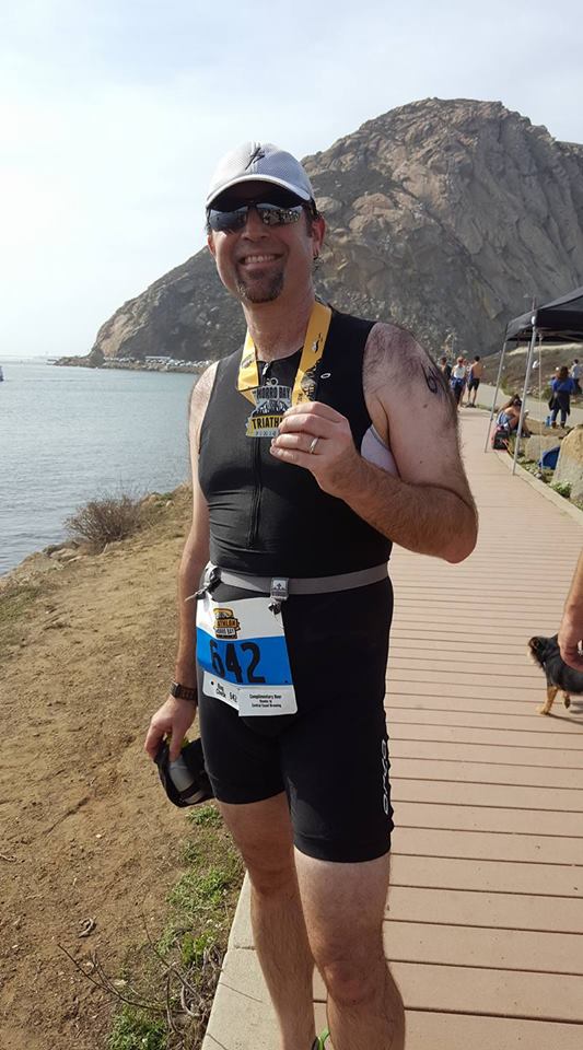 Comments: The start of a run in a triathlon is always on wobbly legs for me and this was no exception. I kept my early pace easy so my legs could get used to the new motion. A half mile in the course veered onto the beach to go over a creek crossing. In years past the creek has been mostly dry due to the drought. This year we had some rain a couple weeks prior so the creek had flowing water. Add the very high tide with large surf and the creek crossing was wide and ankle deep resulting in unavoidable wet feet. I just hoped I would not get a blister. Fortunately my shoes drained fairly quickly but my socks were wet. After getting through the creek the course went down a great trail through a grove of trees that formed a tunnel. The shade was very welcome as the sun was getting warm. Out of the trees it was on to a running path through a park leading to a quiet neighborhood. The offshore wind from the bike ride was nowhere to be found and the heat of the sun started taking it's toll. After two miles my legs and my mind had not quite made it into running mode and I already started taking short walk breaks. Knowing the turn around was just a mile away I pushed myself to keep going as best I could and gave myself a break going up the bluff to the turn around and aid station. Heading down the stairs from the top of the bluff down to the beach my legs really started to complain about how hard I pushed on the bike. My thighs threatened to cramp up and I was very glad this was the only downhill stretch of the run. At the bottom I could see Morro Rock once again looming in the distance, now just 3 miles away with the finish line at it's base. As with the creek crossing, the high tide and surf made the beach a wet mess. It was not the nice damp firm sand I had hoped for. Instead it was large swaths of standing water from where waves pushed water on flat areas of the beach separated by patches of damp sand covering the entire beach up to the dunes with no way to avoid it. A few times a large wave surged the water up into my path reminding me of playing "avoid the water" on the beach as a kid. This time the only choice was to run through it. Finally after slogging through water and wet sand the end of the beach was near. In past years this meant running through soft dry sand up to the parking lot, however the high tide made this easier as the sand was damp and firm. Back on a running trail I pushed myself to keep going all the way to the finish line where I was happy to finish the grueling run. What would you do differently?: Better mental focus during the first half would have helped. The conditions on the beach were tough but manageable had my legs and head been in the game. ![]() Post race