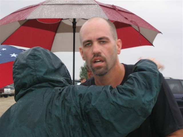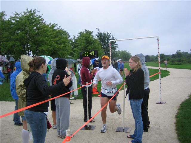 Warm down: Was greeted by Mark and Scott at the finish. Laid down in the grass for a few seconds. How come nobody else does this? Everyone else stands around, I think it feels so good to lay down. I do it every race but I never see anyone else do it. Stood around in the cold and rain and took pics with the friends and family. Waited for Cindy and Laura to come in. What limited your ability to perform faster: Nothing. I went as fast as I could. Event comments: I had a lot of fun and really suprised myself with a great race. I think the rest over the last two weeks did my body more good than any more training would have. I feel fortunate that my base allowed me to pull of this run. I had absolutely no idea I was capable of keeping that kind of pace for the first 11 miles. I thought I would die at 6. I'm extremely pleased with this, especially after what I felt was a disappointing effort at Pleasant Prairie. Note - pics added - Mark K finishing strong, Schmize finishing strong, me finishing. In the one close up I look better than I feel :) Oh - I almost forgot. That firefighter? He finished in 3:17, not long after us due to his early start, and I went over and shook hands and congratulated him on his effort. It was remarkable. Last updated: 2006-08-21 12:00 AM