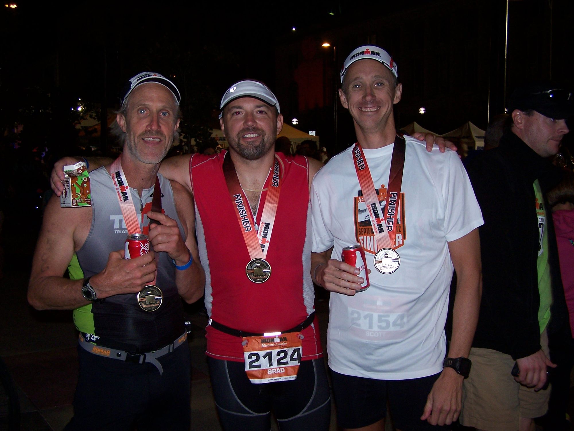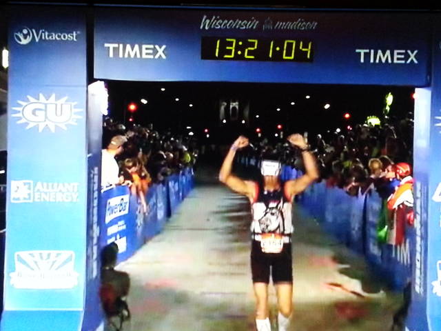 Warm down: I went to the food area and grabbed a single piece of pizza that I played with and looked at for about 15 minutes before I finally threw it in the garbage. I actually took one bite and spit it out because it was making me sick. I was able to drink a can of coke and that seemed to temporarily rejuvenate me. Met up with Colleen, Brad, Tom, Ginger & Kari and we chatted about our adventures. Got the picture of the three of us finishers below. We decided to go back to the hotel, shower up and then come back at 10 to watch the last finishers come in before midnight. It's amazing how after a nice hot shower at the hotel and two hours after my finish I was completely starving. I went back to the food tent and plowed through 4 pieces of pizza, 2 bottles of water and another can of coke. Suddenly I felt GREAT and hung with Brad, Tom & Kbreitz until midnight to watch the last finisher cross the line. It was a great conclusion to a great evening. What limited your ability to perform faster: Nothing. I did the best I could and am very happy with the completion of my first Ironman. Event comments: Without doubt I can say this is the most demanding physical endeavor I have ever taken on. The amount of time, work, sweat & effort that was involved is something I will never forgot. There were a ton of people who helped me in this multi-year journey and a special thanks to all of them including the fellow Donkeys and triWI member who swam, biked & ran with me. And lastly and most importantly, my wife Colleen who supported me through all this nonsense and all my crankiness..especially leading up to race day! Also a great job to Ironman & WTC for being a class act putting on a great race in a great city. I loved everything about Ironman Wisconsin and would recommend it to anyone. Last updated: 2011-10-11 12:00 AM