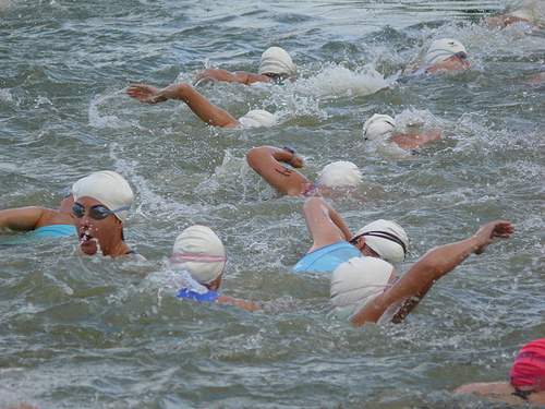 Comments: Near the start I felt my ankle strap come off, and I turned around and rooted around in the water for it for about a minute (see below - something is wrong with this picture) and found it. So relieved! I kept it in my fist the rest of the way, so my pull on that side was pretty gimpy. Because of the chip snafu my 11:59 time on the books was swim + T1, so the time was an estimate. Got it on my watch though so will have to find the actual splits. What would you do differently?: Safety pin the strap together ![]() Transition 1