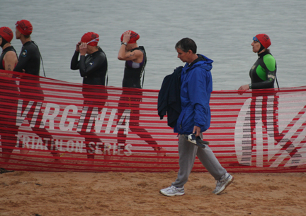 Setting up transition. Trying to keep everything dry. Got on the wetsuit and booties and headed down to the beach. Got wet, took a few strokes. Cold! Hung out until my wave (8th and last) went off.