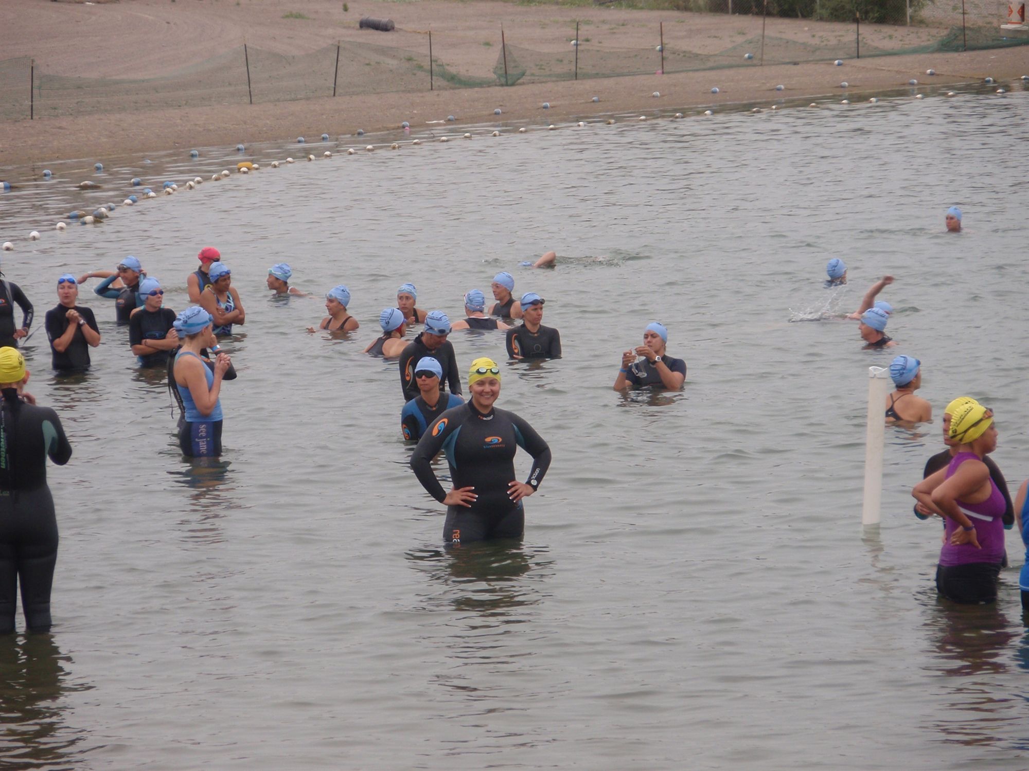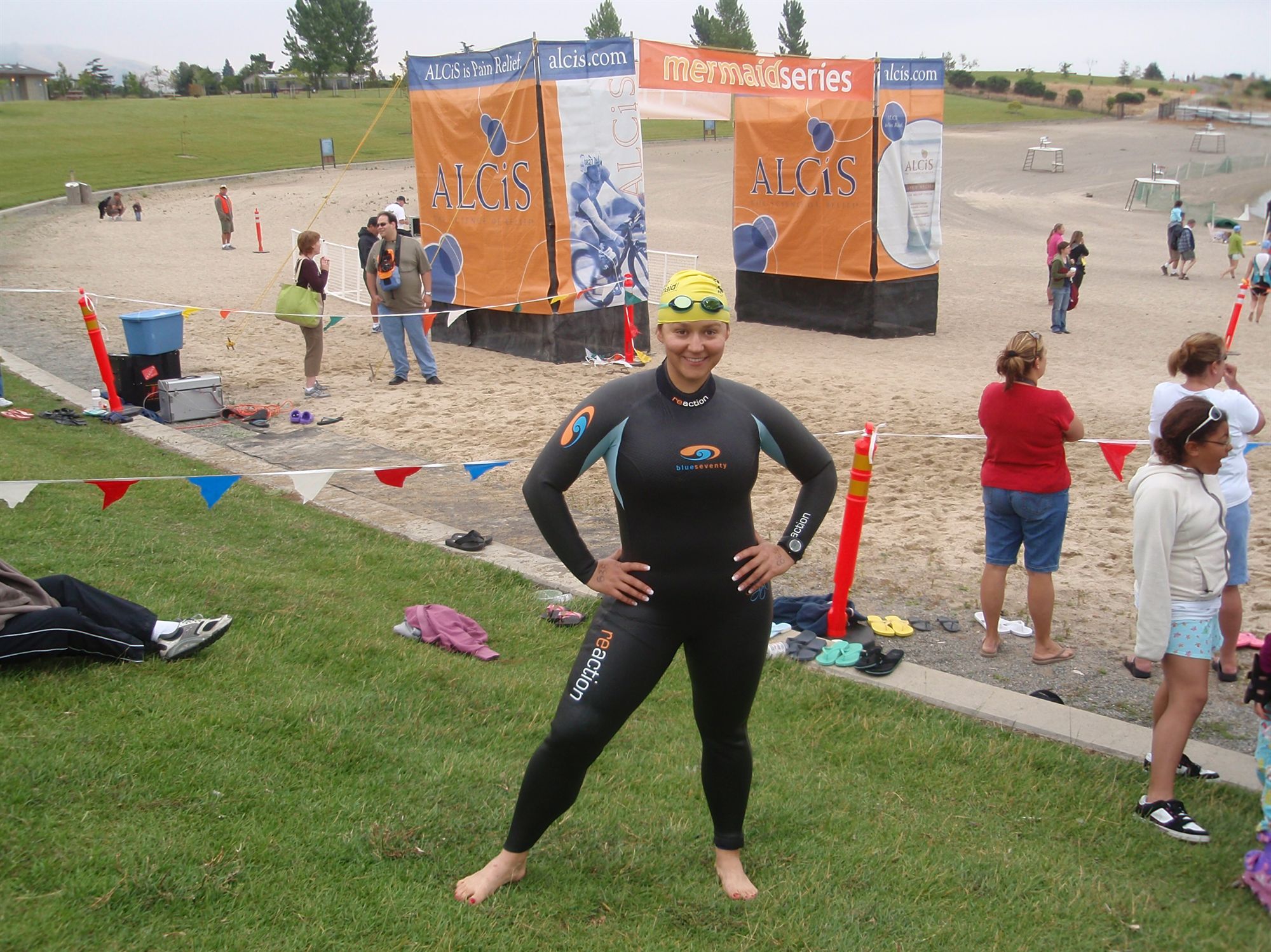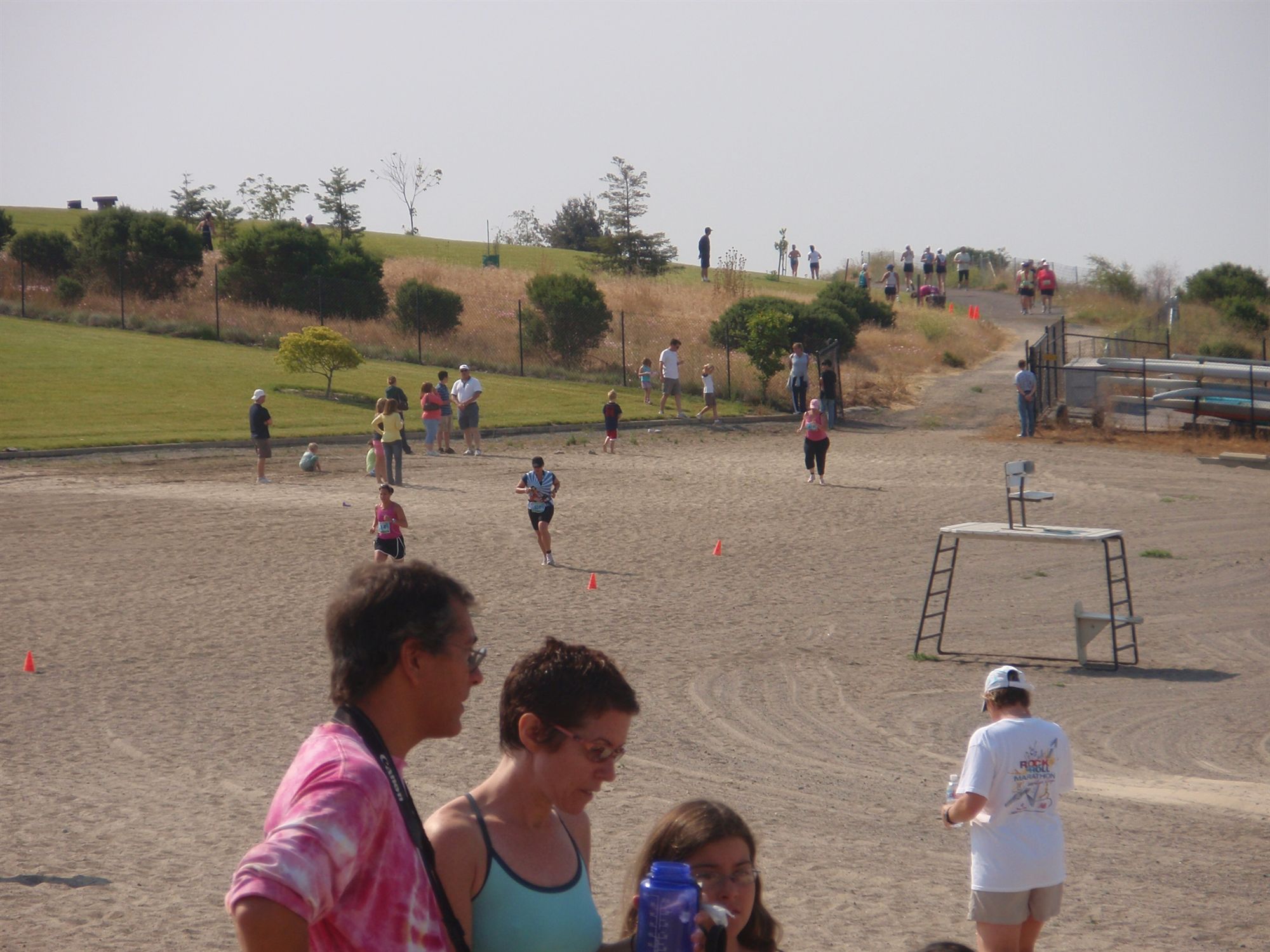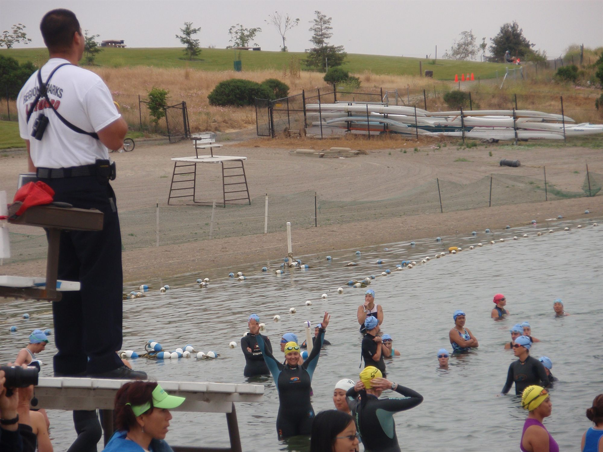 I spent about 20+ minutes in the water before the swim. The water was super warm compared to Lake Berryessa, so I swam out and back a few times which felt very good. Then just hung out in the shallows chatting with a couple of girls that were in For Fun division with this being their first tri and first OWS. Tried to get them to relax about the swim.