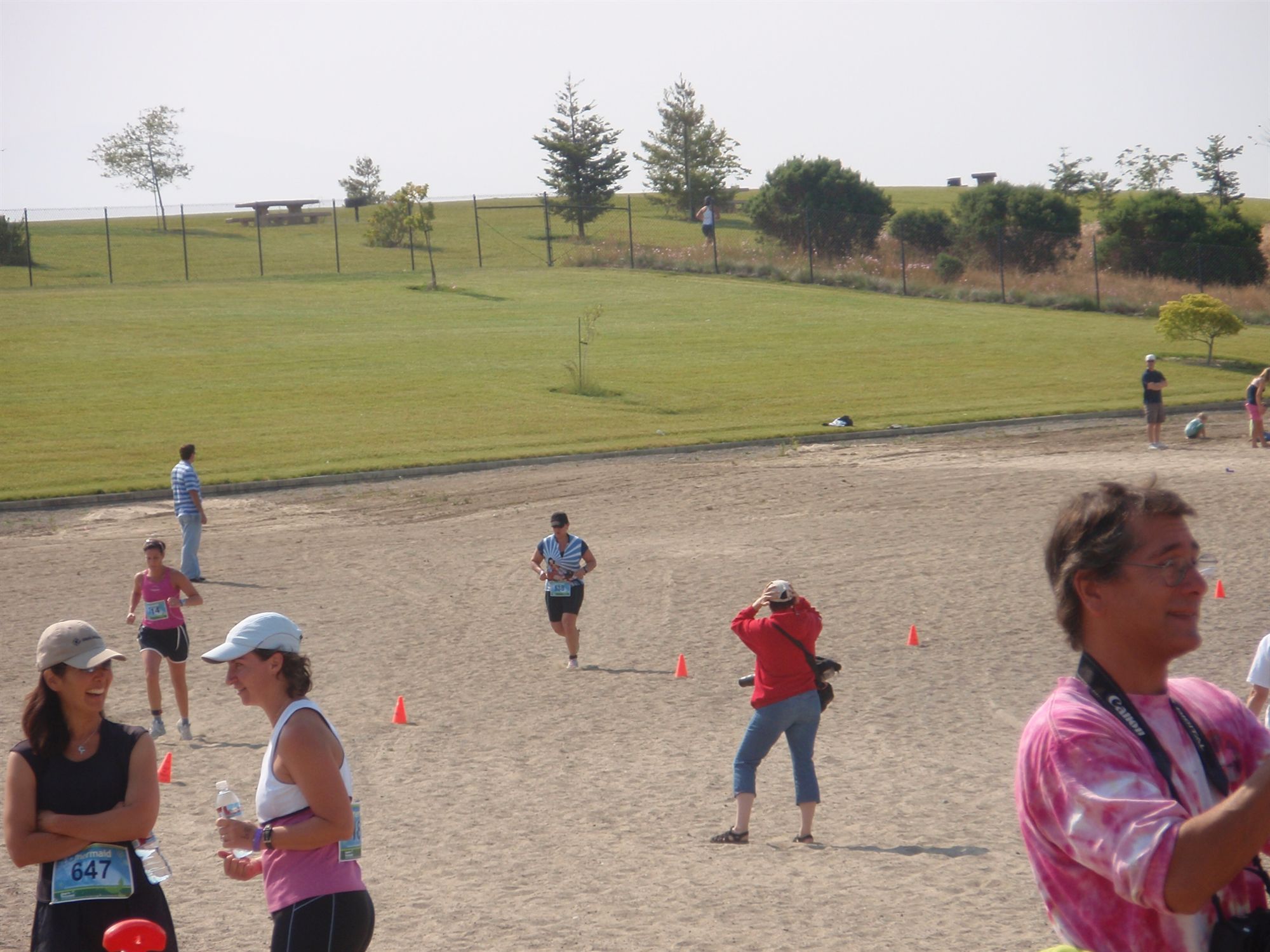 Comments: Water was pretty warm, which was a nice change from my experience at the Napa Valley Sprint. This was a running start, which was different for me and I think this got my adrenaline pumping more than I wanted it to. I positioned myself in the 1st row on the far left of the start area. Once the signal was given I charged ahead, plunged into the water and started swimming. The combination of my desire to get a good swim time, how much easier it is to swim in a wetsuit, running start and adrenaline I was going at a much higher pace than I can sustain for the whole course length, so naturally I started running out of breath as I was getting close to the 1st bouy. I tried to switch to breathing every second stroke, but I was still having difficulty managing my breathing. I should have stopped to catch my breath, but I wanted to keep moving, so I switched to my "modified" freestyle with my head completely out of the water leaning onto the left shoulder while still doing the freestyle stroke. This is not the most efficient way to swim, but I can still move faster than breast stroke. So I swam most of the remainder of the distance this way. I was able to get back into normal freestyle form 20-30 yards after I rounded the 2nd bouy. I swam the rest of the distance until I could reach the bottom of the lake, then stood up and charged out of the water. I was pretty out of breath by that point and couldn't even look into the camera, so I am pretty sure my picture will look horrible. Oh well :) I started to unzip my wetsuit as soon as I exited the water, so it was easy to peel the top off. After exiting the water you have to run up the hill, part sandy beach, part grassy hill. Running uphill after the swim was pretty tough, but I was able to run and catch my breath on the flat portion leading up to the transition area. I wanted to be under 10 min for the swim and ended up with 10:15, so not great, but better than my 1st tri.Per official record I was 13th in swim, but first 10 participants’ time chips did not register, yet they put them first on the ranking. Not sure why. Out of participants whose chips registered I was 3rd on the swim. What would you do differently?: Practice swimming in a wetsuit both in the pool and in OW, but primarily in OW to get used to managing sustaining pace. Train to manage my adrenaline, maybe practice running starts every time I do OWS practice. ![]() Transition 1