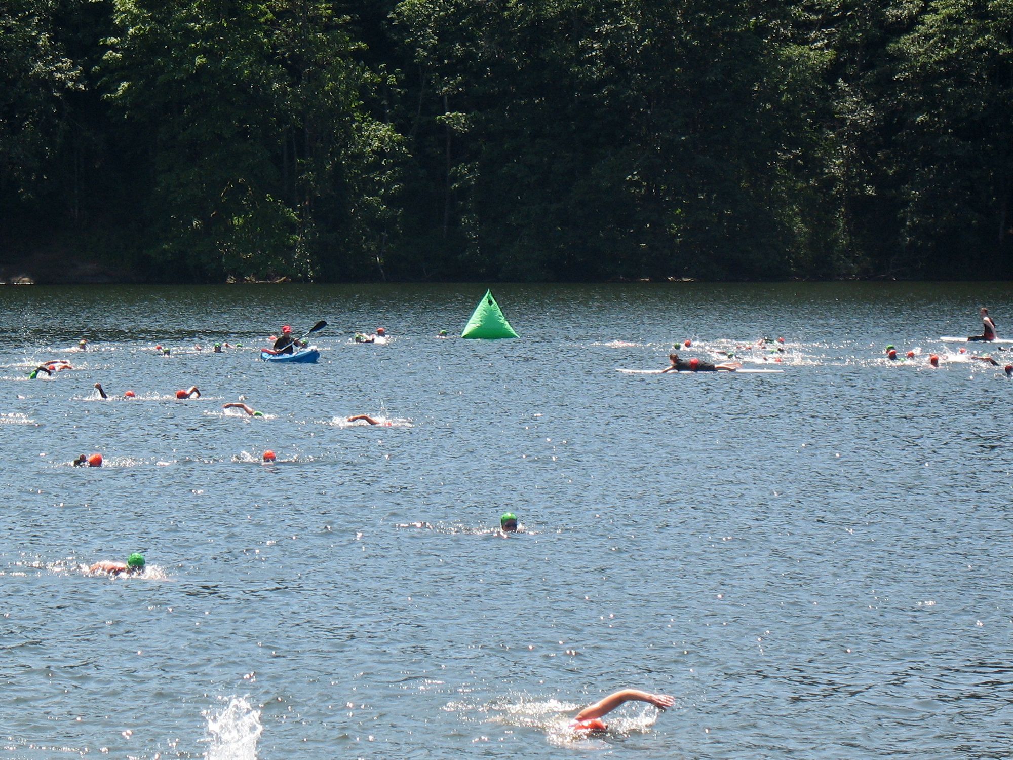 We got there in plenty of time to park and pick up my packet before they let us in the transition area at 12 noon. So after I picked out a spot for my bike and laid out my stuff, I kinda jogged around to get warm. Went in and out of the transition area a few times and counted the racks from each direction so I would be able to quickly go to the right one in each transition. Finally when I felt warm, I got in the water for a little swim. I forgot to put in my ear plugs, so I didn't put my head down. I talked a little too long to one of my neighbors on the rack, so this last part was a little rushed. When I went back for my earplugs, I couldn't find them right away, so I was nearly or could have been the very last one to leave the area when the call came for the swim. But not to worry--first we had to listen to a "pep" talk with information about the swim course, and the overall course, and anyone who can't swim, please don't get in the water! (he, he) Okay, ready to go!
