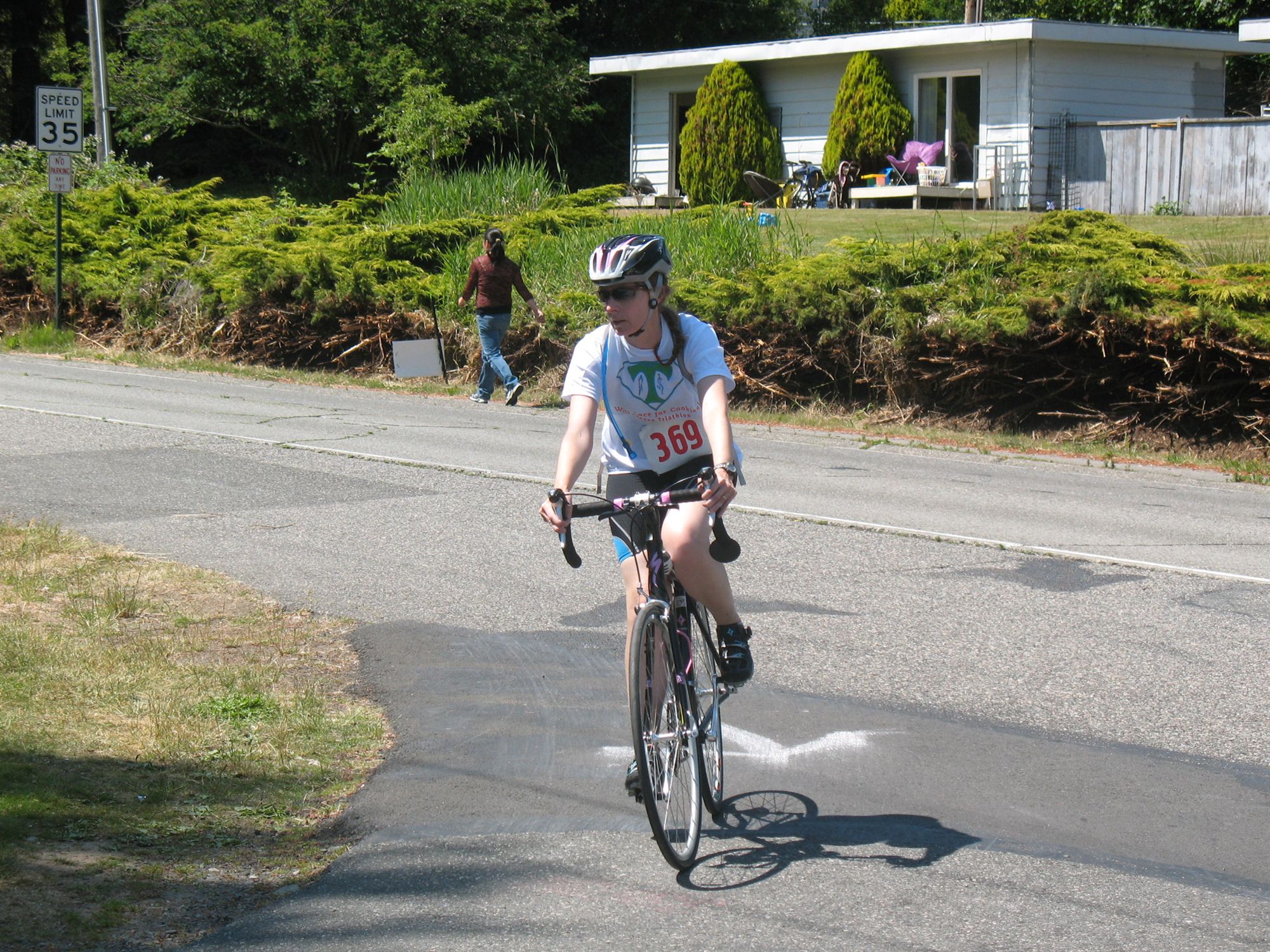 Comments: I don't know why my time is over 4 minutes. Guess I was a slow walker or something or took too long to organize my stuff! Once across the timing mat, then we were allowed to mount or continue walking our bikes up a short hill to the road to mount there. I went past the timing mat a teeny distance and got on. My bike was already in a low enough gear that I could easily ride up the incline and make the right turn onto the road shoulder. (Apparently, some people in the first tri that day, tried to ride up in the wrong gear and fell over when they realized that it was a hill!) What would you do differently?: Not much, except maybe practice putting socks on wet feet while standing up. It's a little harder than putting them on dry feet (although I dried my feet a teeny bit on my towel, I didn't want to take a lot of time). Oh, also just take off and put on things faster! ![]() Bike